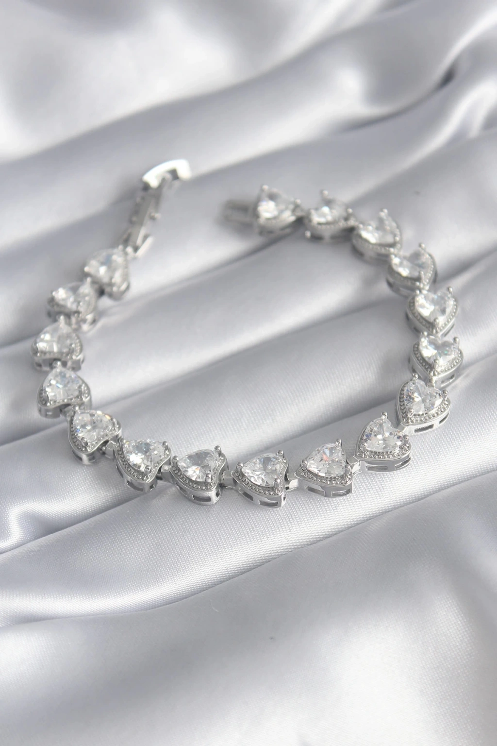 BFS Pirinç Gümüş Renk Zirkon Taşlı Kalp Model VIP Seri Kadın Bileklik