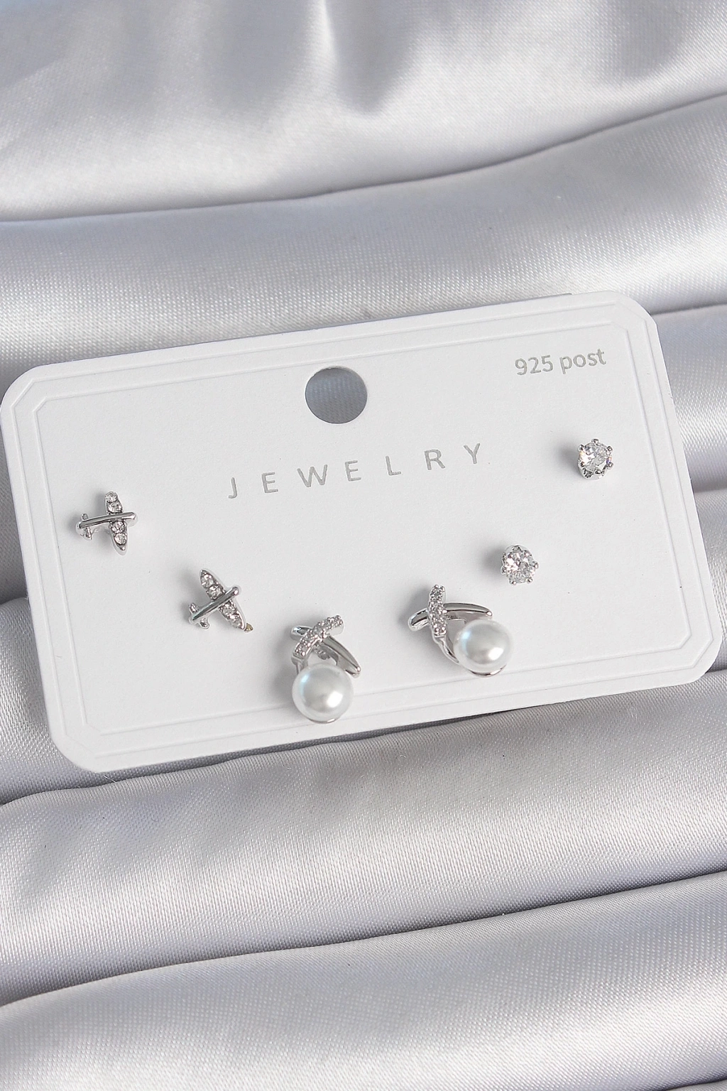 BFS Pirinç Gümüş Renk Zirkon Taşlı Kelebek Model İnci Detay 925 Ayar Gümüş Çivi Kadın Küpe Seti