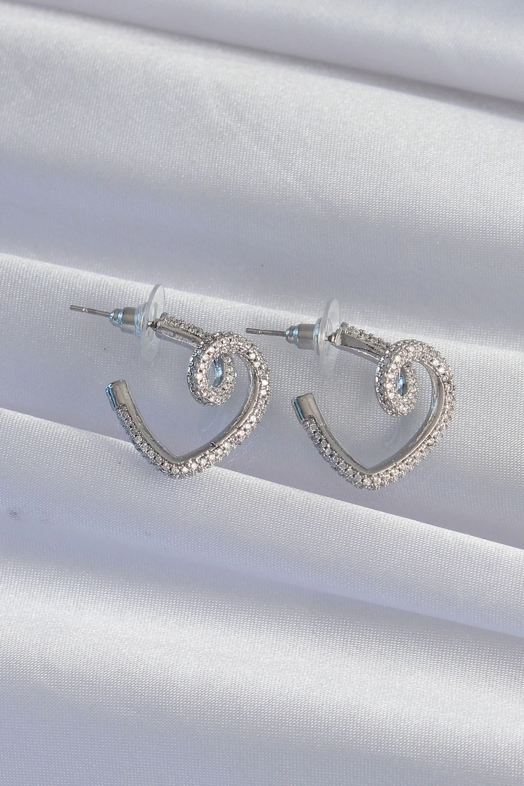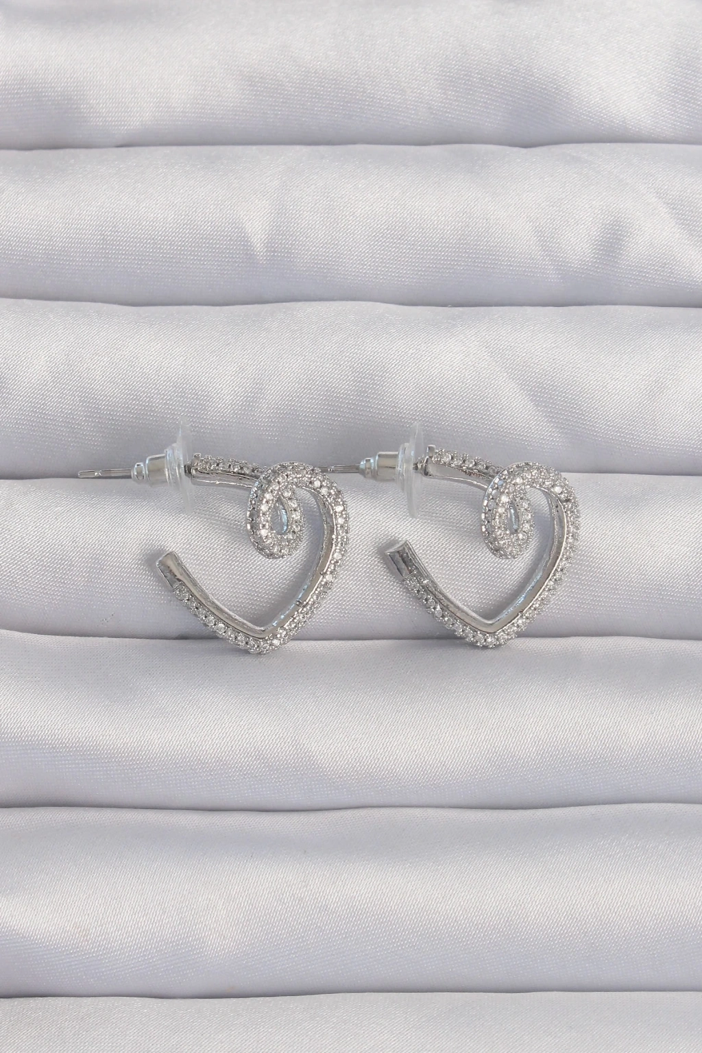 BFS Pirinç Gümüş Renk Zirkon Taşlı Kıvrımlı Yarım Kalp Küpe