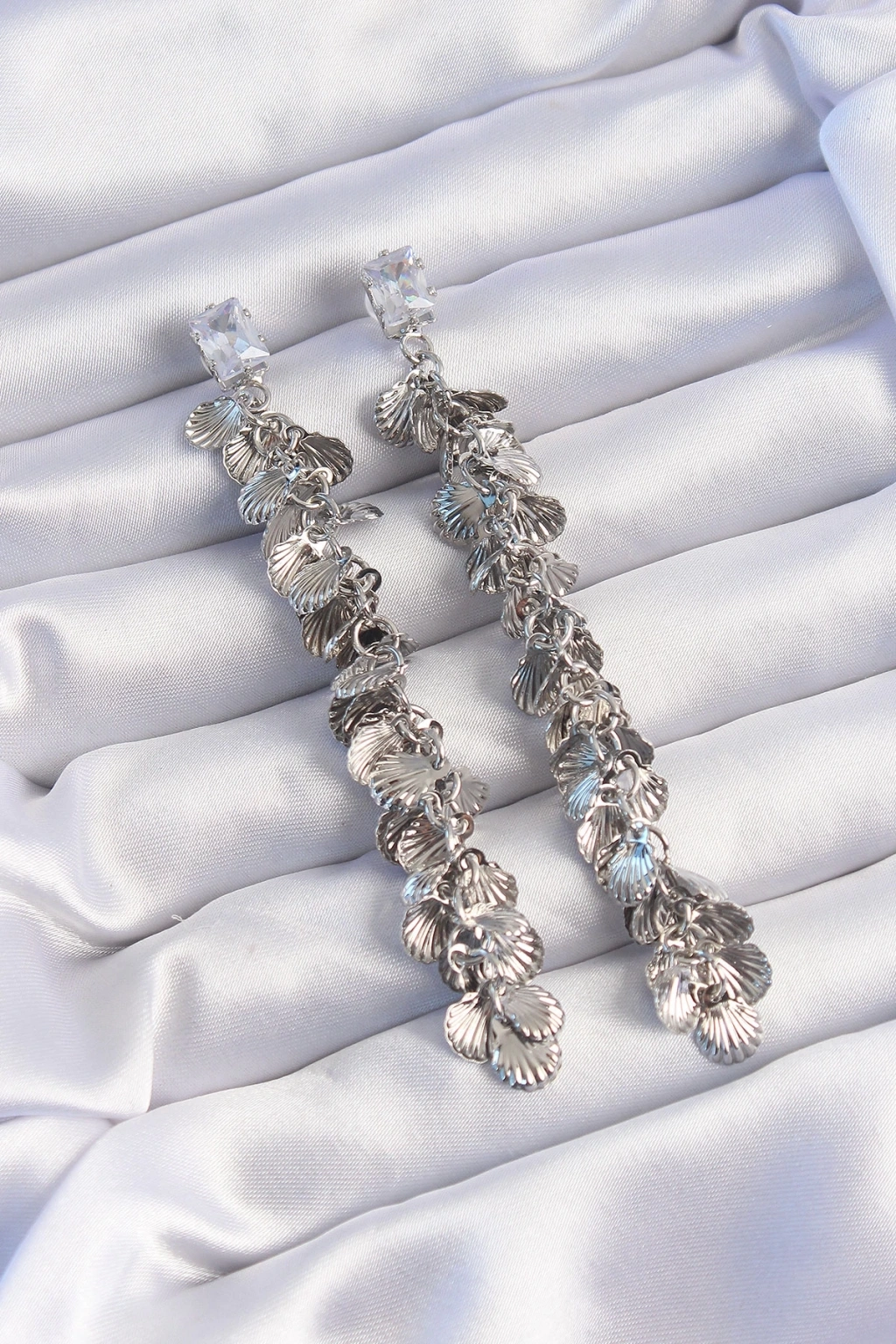 BFS Pirinç Gümüş Renk Zirkon Taşlı Minimal Deniz Kabuklu Sallantılı Küpe
