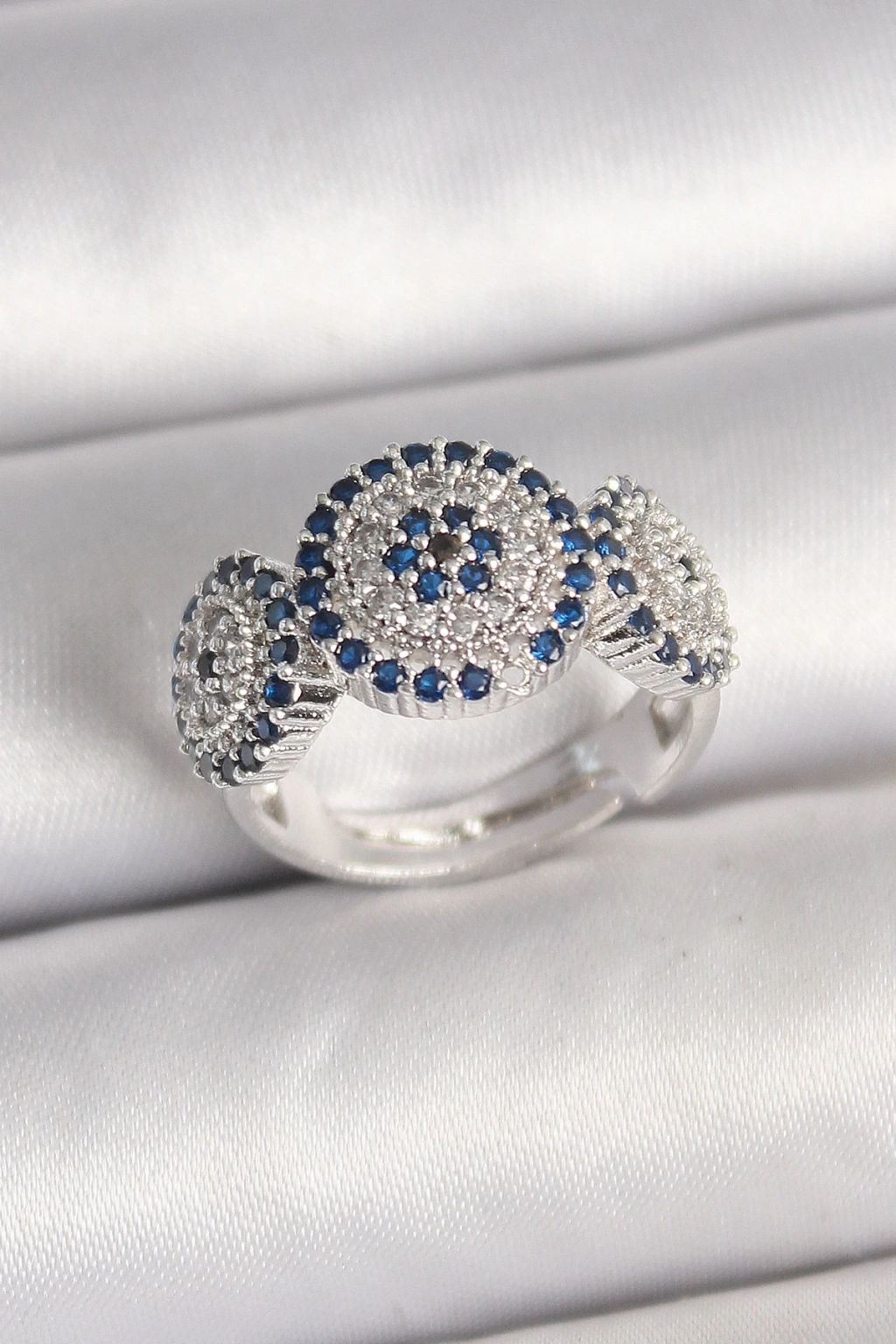 BFS Pirinç Gümüş Renk Zirkon Taşlı Nazar Boncuk Model Ayarlanabilir Kadın Yüzük
