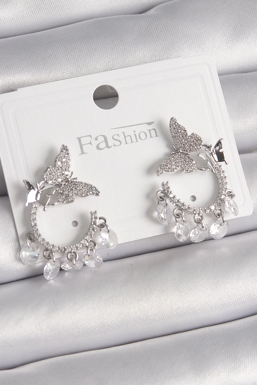 BFS Pirinç Gümüş Renk Zirkon Taşlı Sallantı Detay Kelebek Model Kadın Küpe