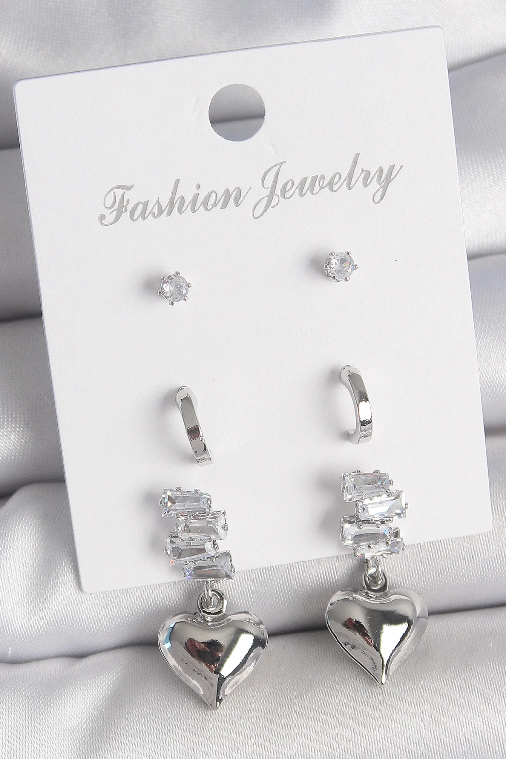 BFS Pirinç Gümüş Renk Zirkon Taşlı Sallantılı Kalp Model Yarım Halka Detay 3 Çfit Kadın Küpe Seti