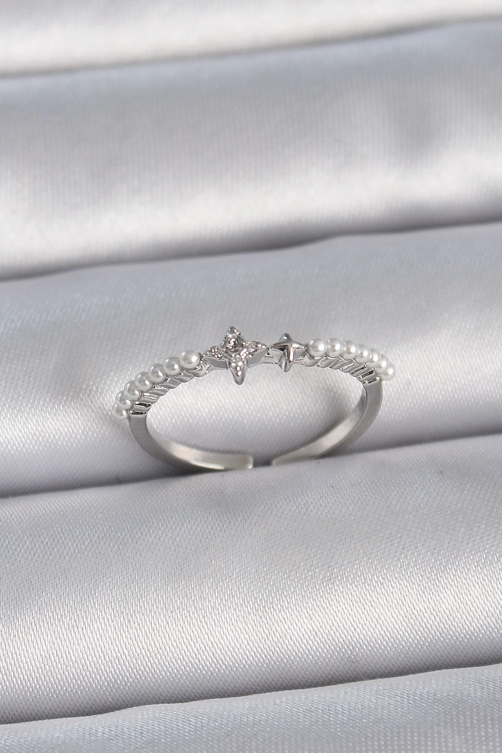 BFS Pirinç Gümüş Renk Zirkon Taşlı Sıralı İnci Ayarlanabilir Model Kadın Yüzük