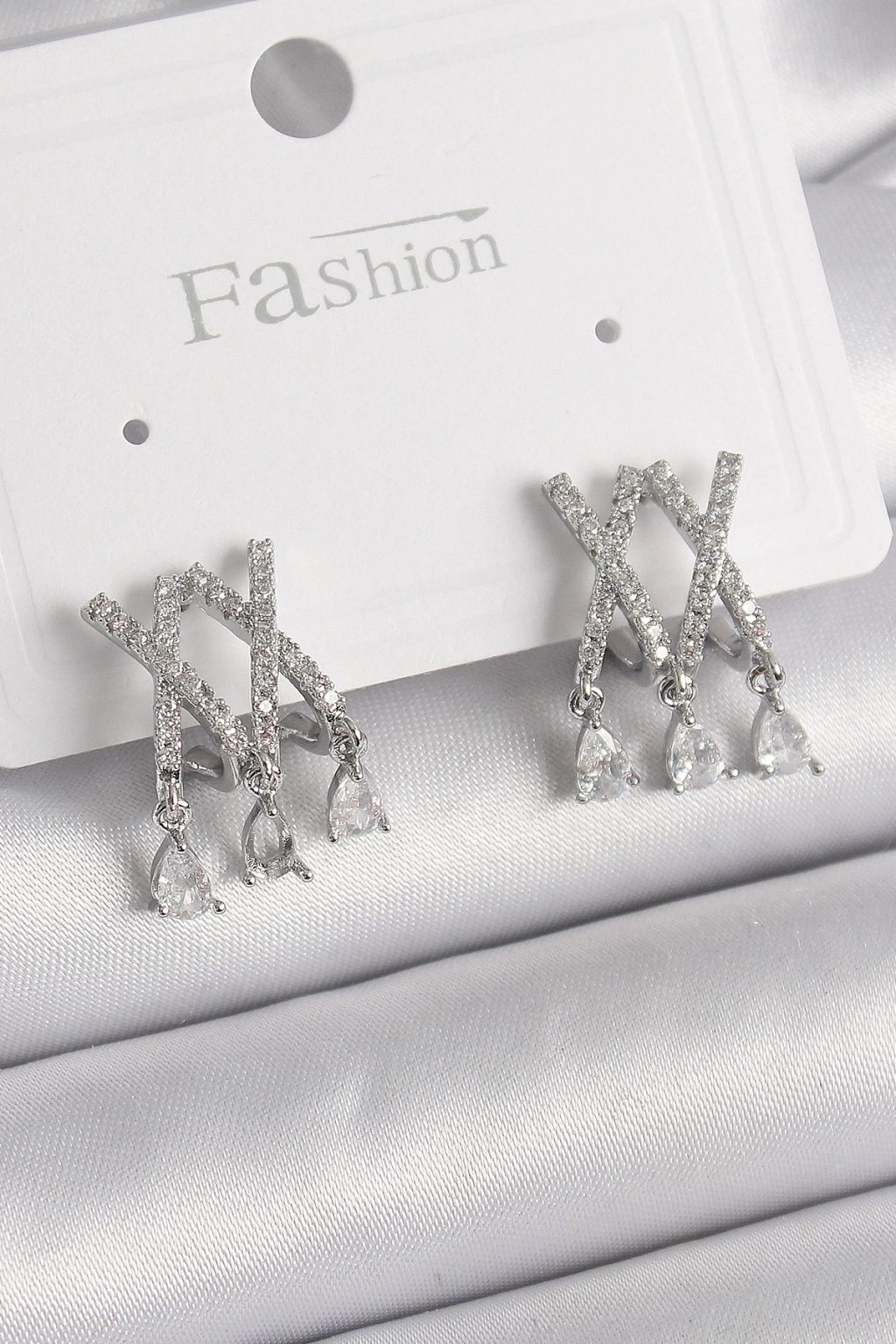 BFS Pirinç Gümüş Renk Zirkon Taşlı X Model Sallantı Detay Kadın Küpe