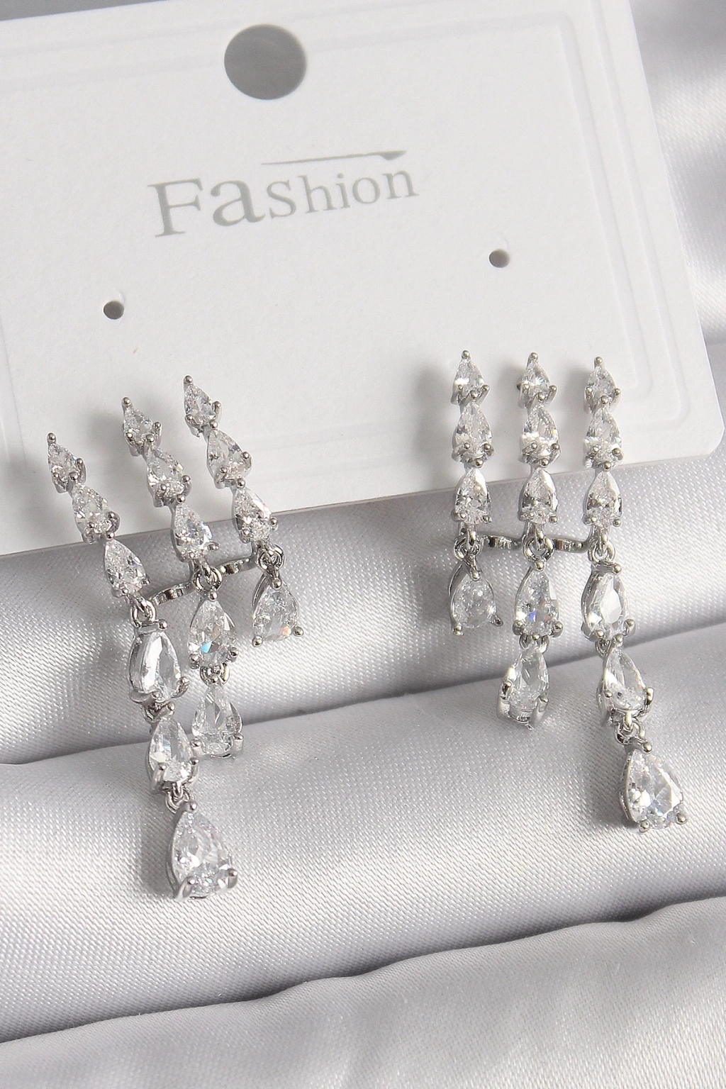 BFS Pirinç Gümüş Renk Zirkon Taşlı Yağmur Model Kadın Küpe