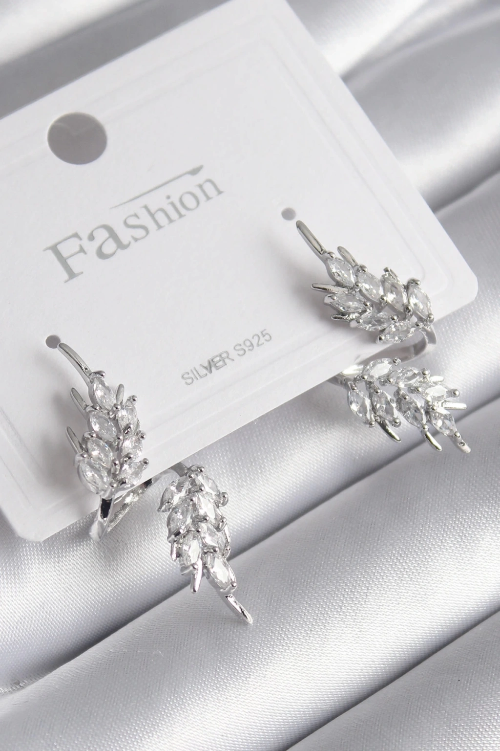 BFS Pirinç Gümüş Renk Zirkon Taşlı Yaprak Model Kadın Küpe