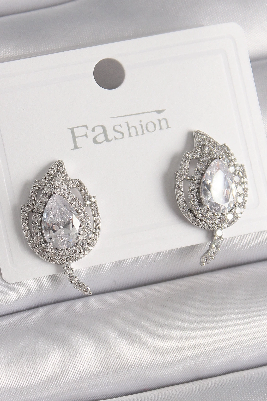 BFS Pirinç Gümüş Renk Zirkon Taşlı Yaprak Model Kadın Küpe