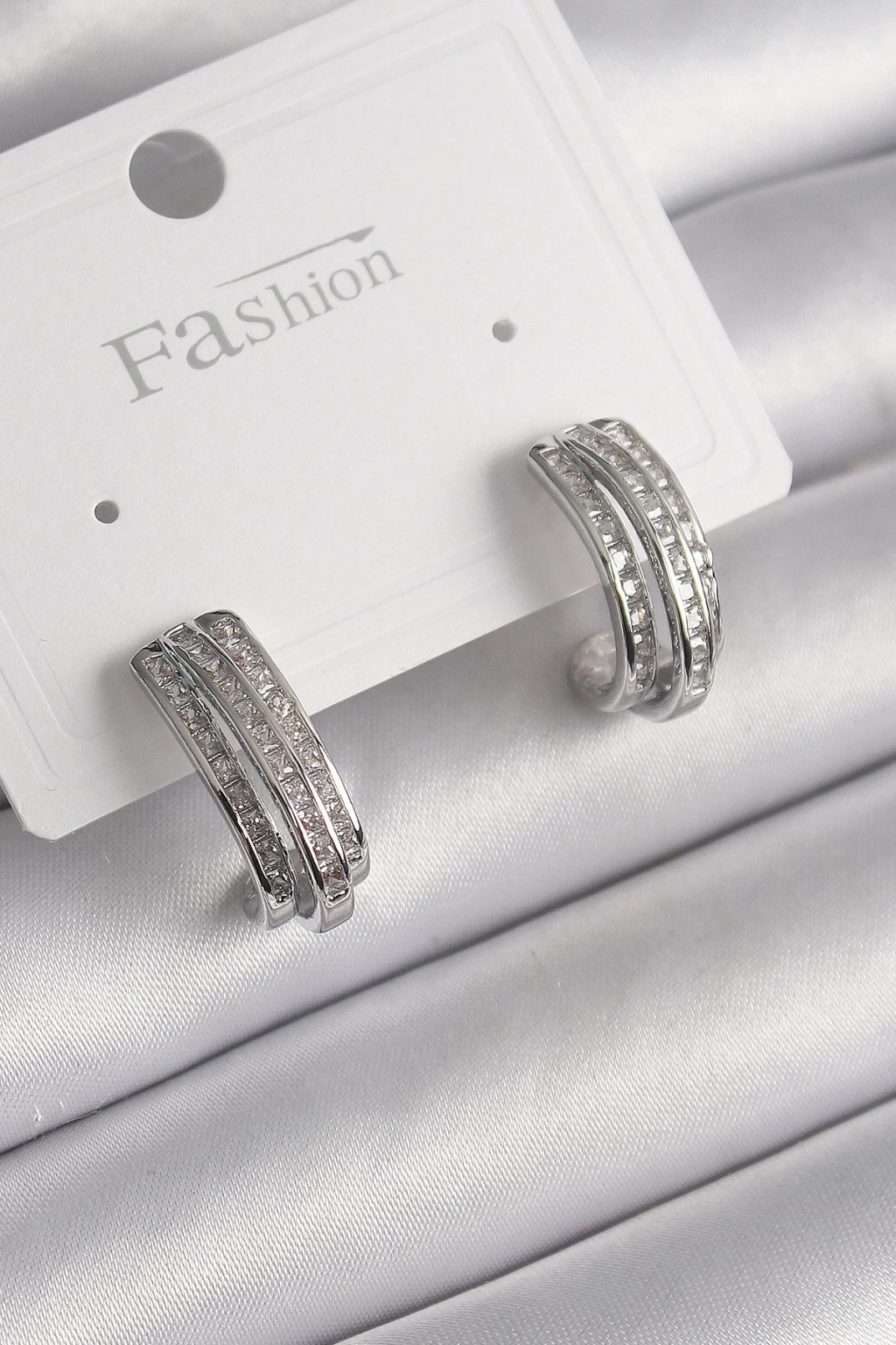 BFS Pirinç Gümüş Renk Zirkon Taşlı Yarım Halka Model Kadın Küpe