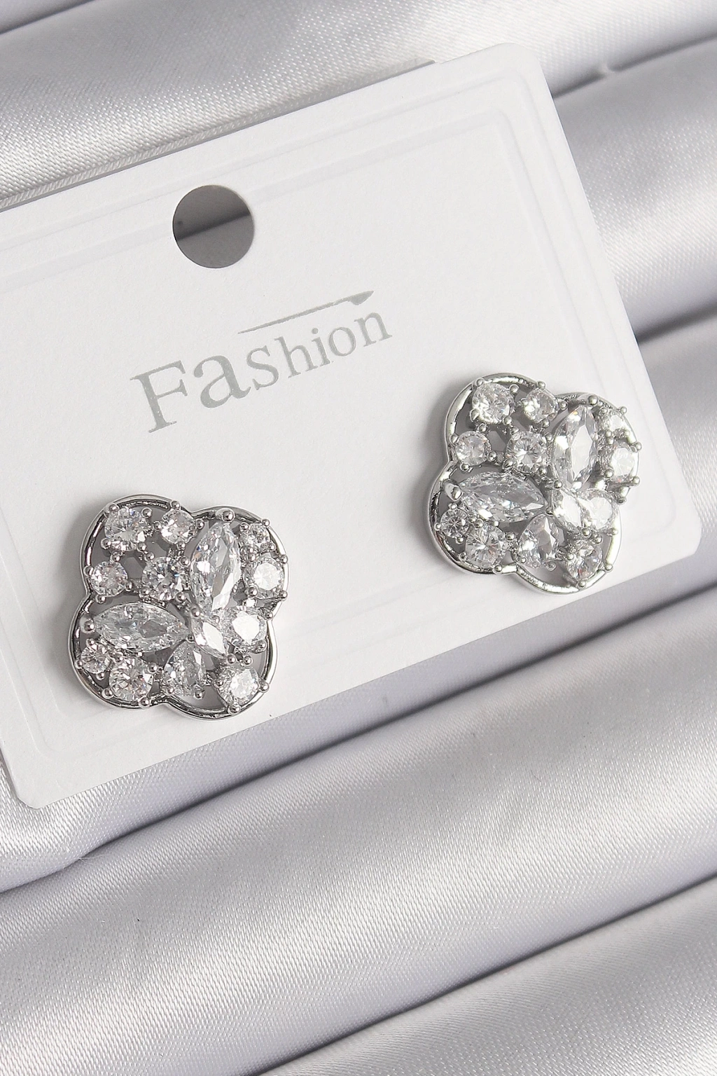 BFS Pirinç Gümüş Renk Zirkon Taşlı Yonca Model Kadın Küpe