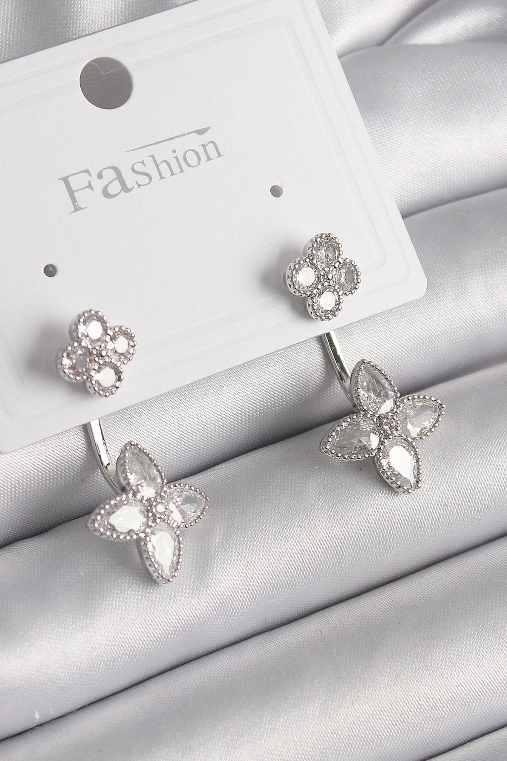 BFS Pirinç Gümüş Renk Zirkon Taşlı Yonca Model Kadın Küpe