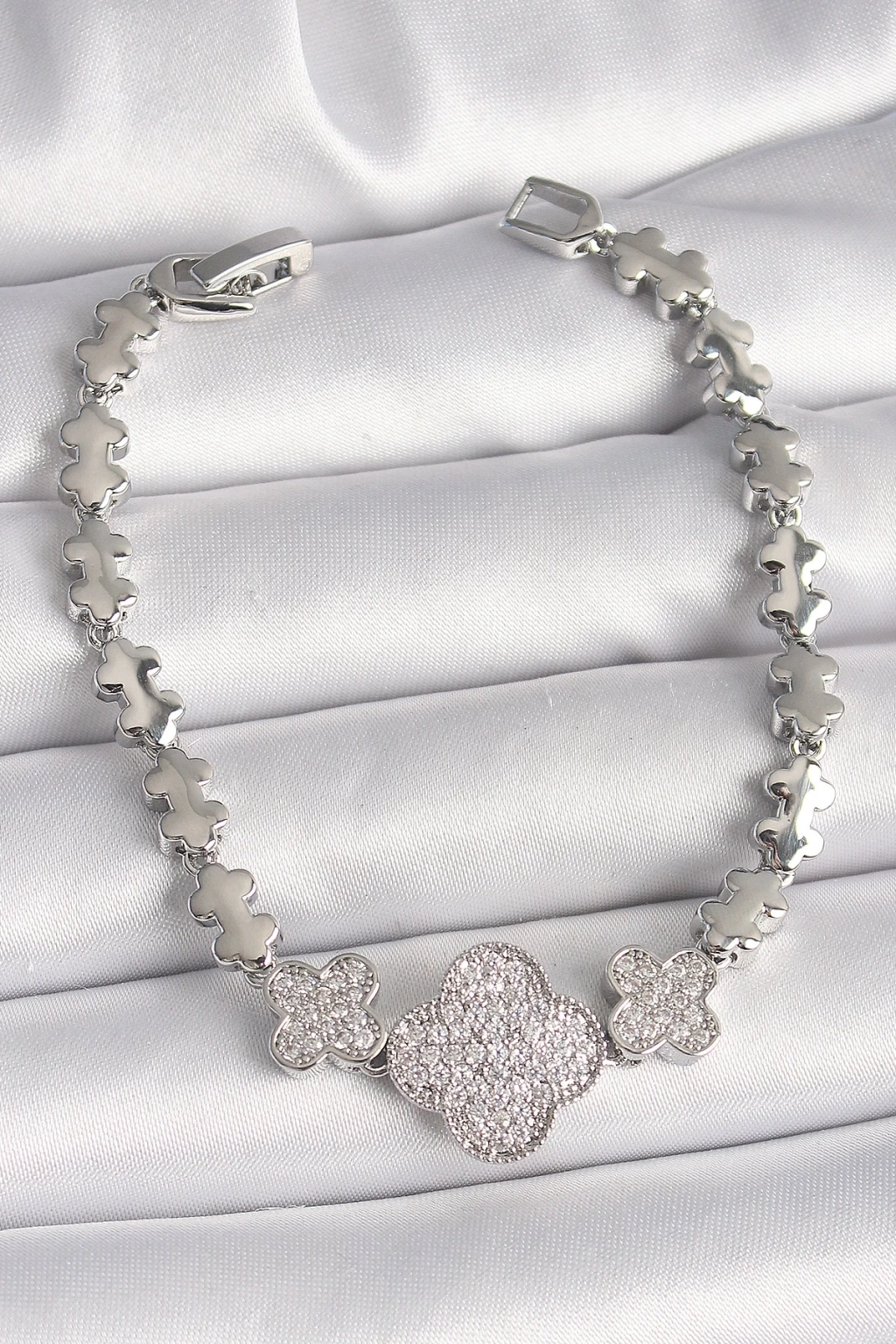 BFS Pirinç Gümüş Renk Zirkon Taşlı Yonca Model Zincir Model Kadın Bileklik