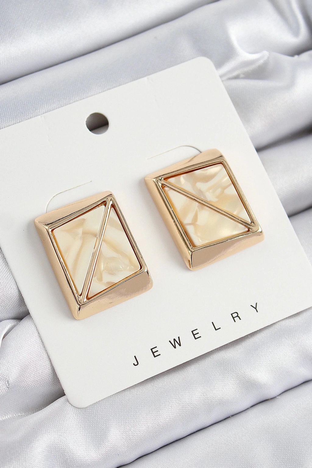 BFS Pirinç Krem Üçgen Kesim Detaylı Kare Model Vintage Gold Renk Kadın Küpe
