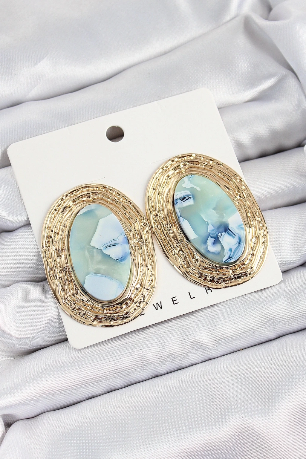 BFS Pirinç Mermer Desenlli Mavi Sedef Oval Vintage Model Gold Renk Kadın Küpe