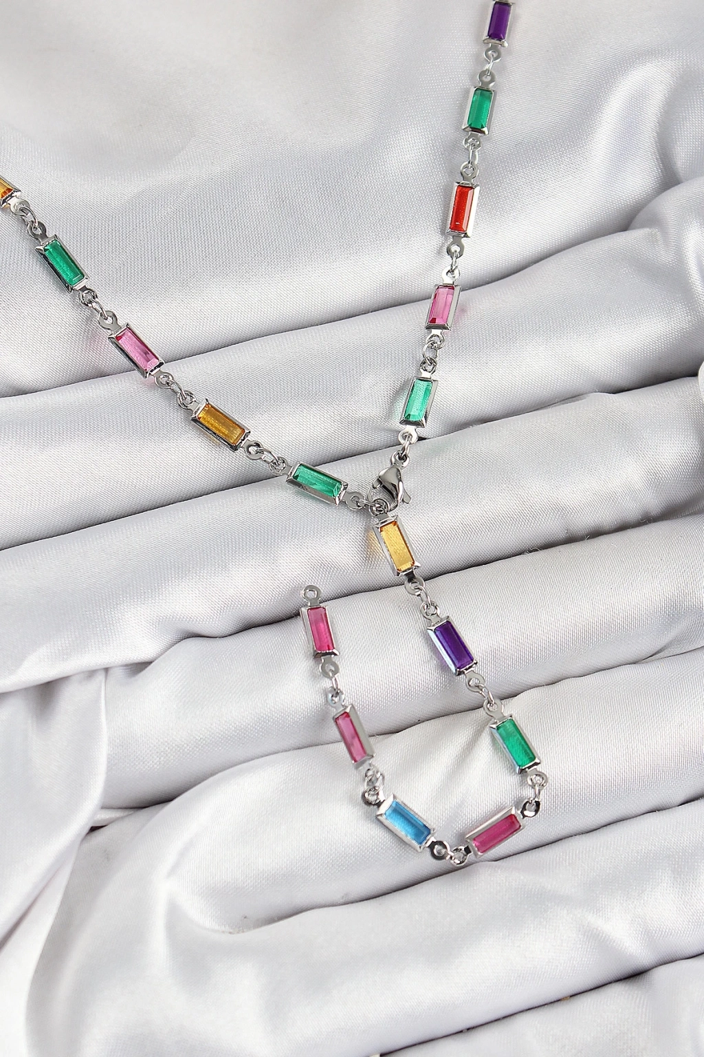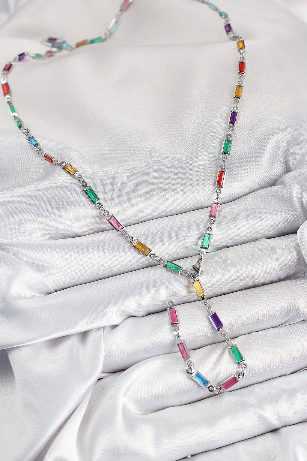BFS Pirinç Renkli Zirkon Taşlı Dikdörtgen Model Gümüş Renk Kadın Y Kolye