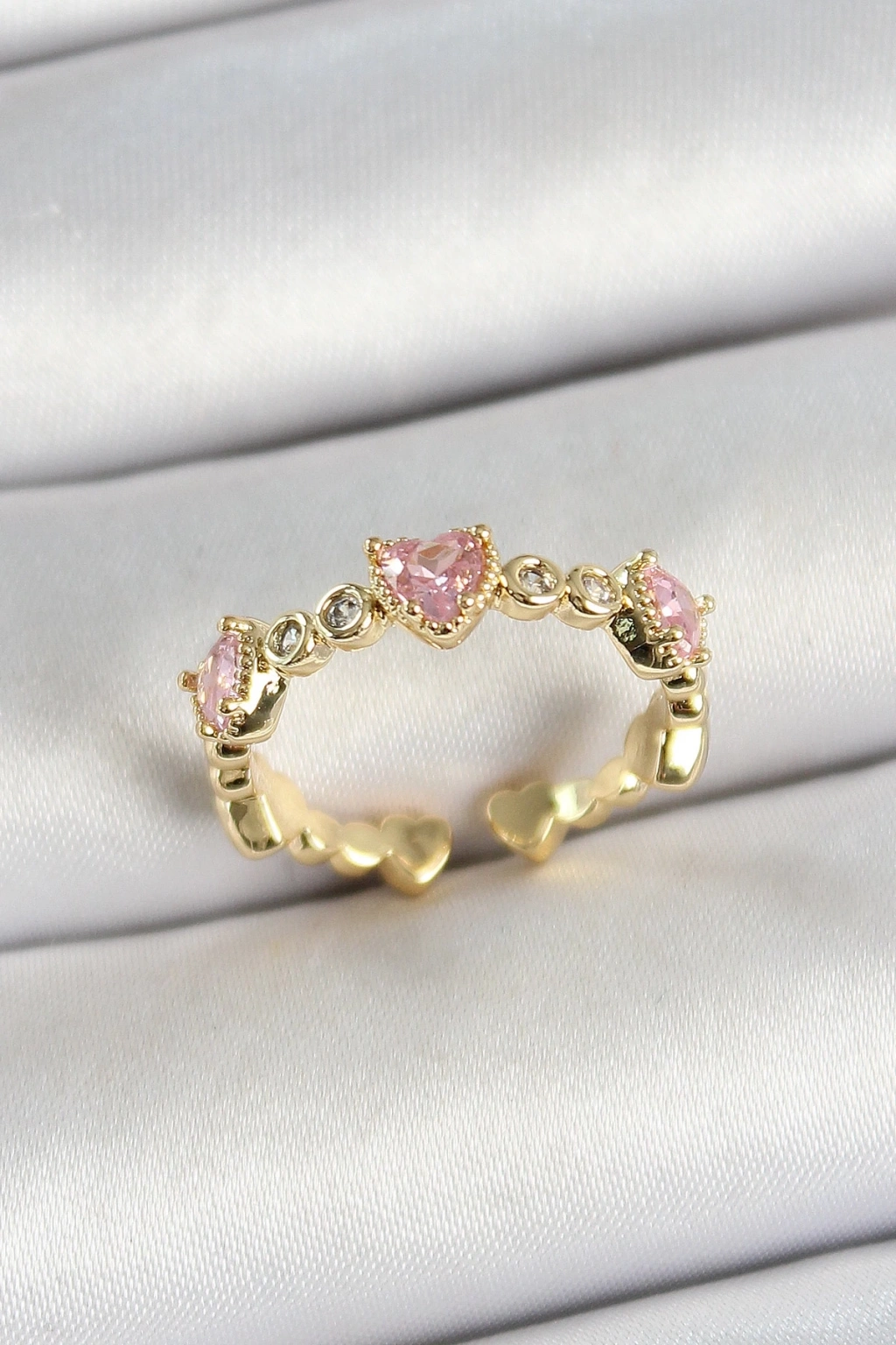 BFS Pirinç Sıralı Kalp Figürlü Zirkon Taşlı Gold Renk Ayarlanabilir Kadın Yüzük