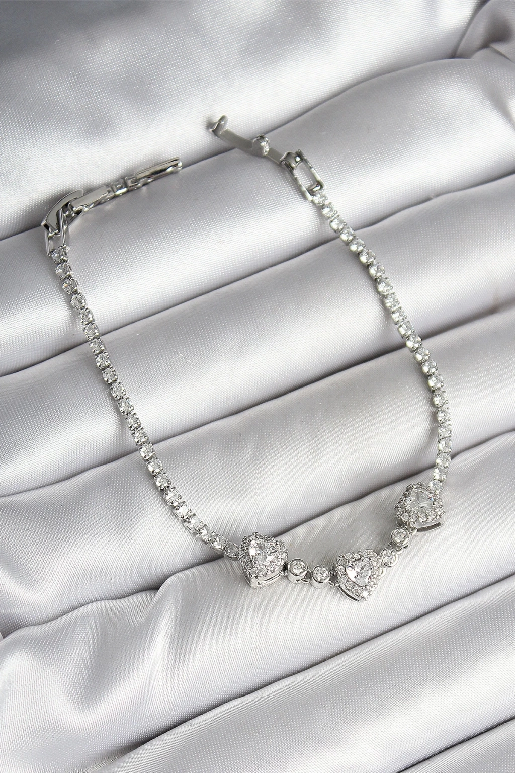 BFS Pirinç Sıralı Kalp Figürlü Zirkon Taşlı Gümüş Renk Kadın Bileklik
