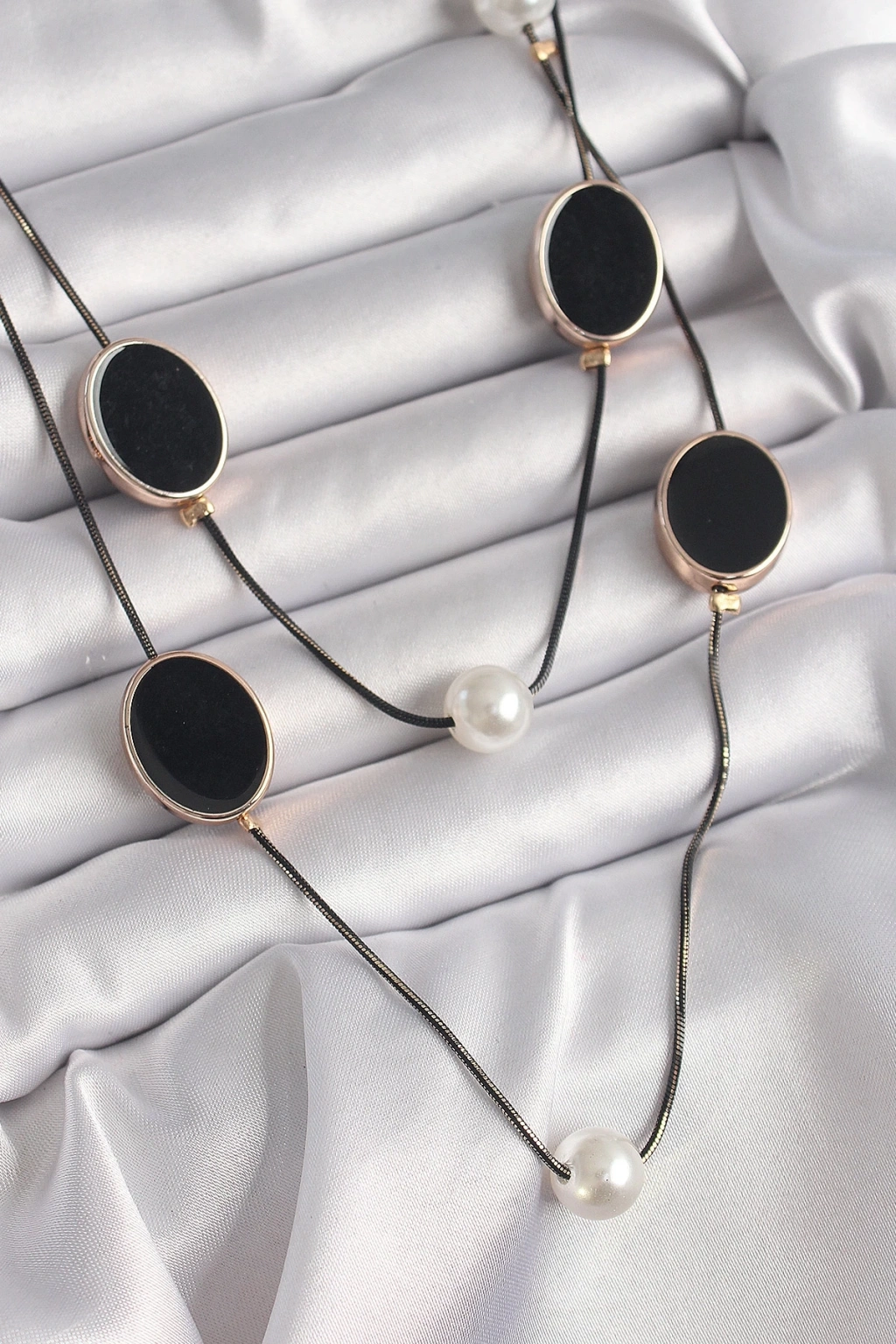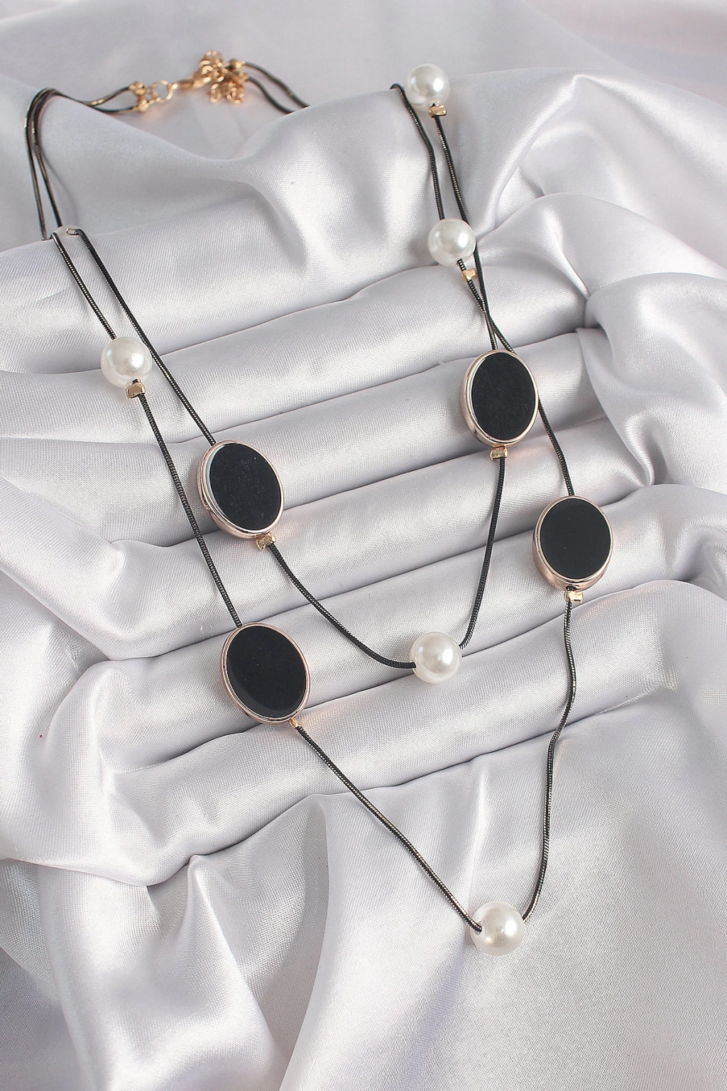 BFS Pirinç Siyah Renk Zincir İnci Detaylı Çoklu Kadın Kolye