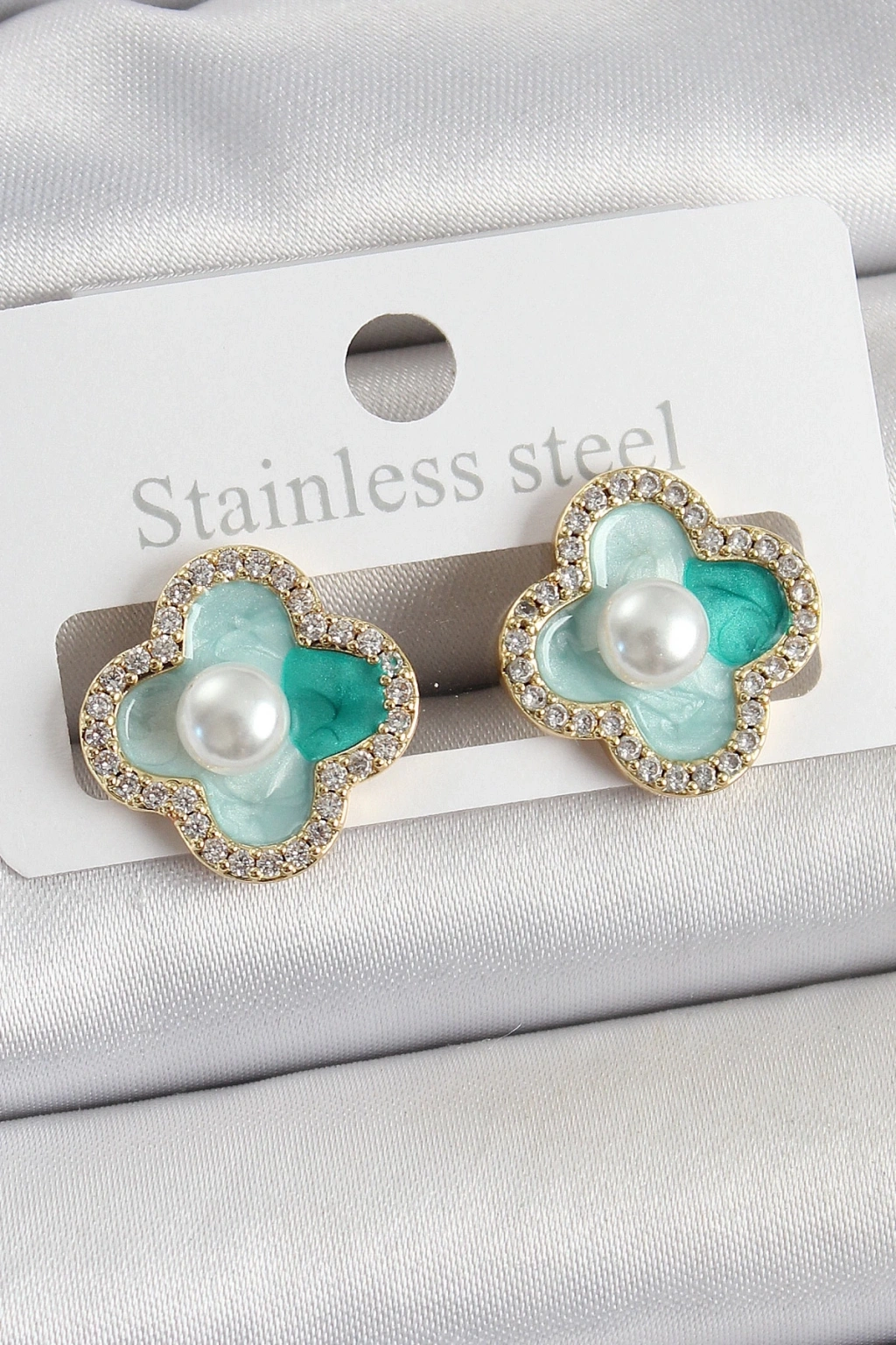 BFS Pirinç Yeşil Mineli İnci Detaylı Zirkon Taşlı Sanatsal Portre Yonca Model Gold Renk Kadın Küpe