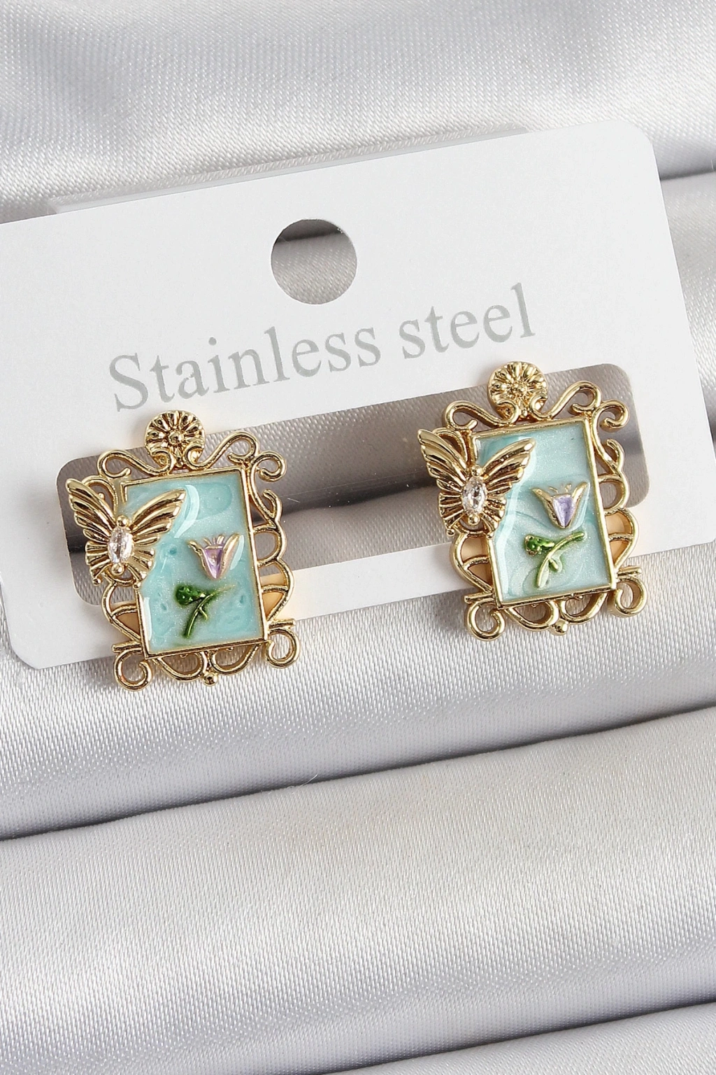 BFS Pirinç Yeşil Mineli Sanatsal Portre Model Gold Renk Kadın Küpe