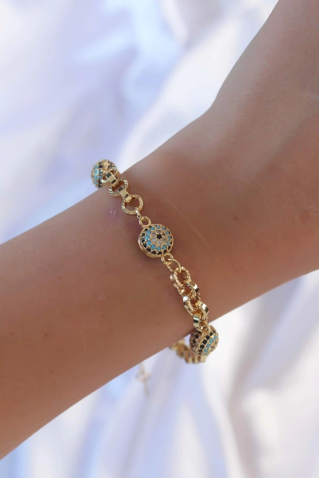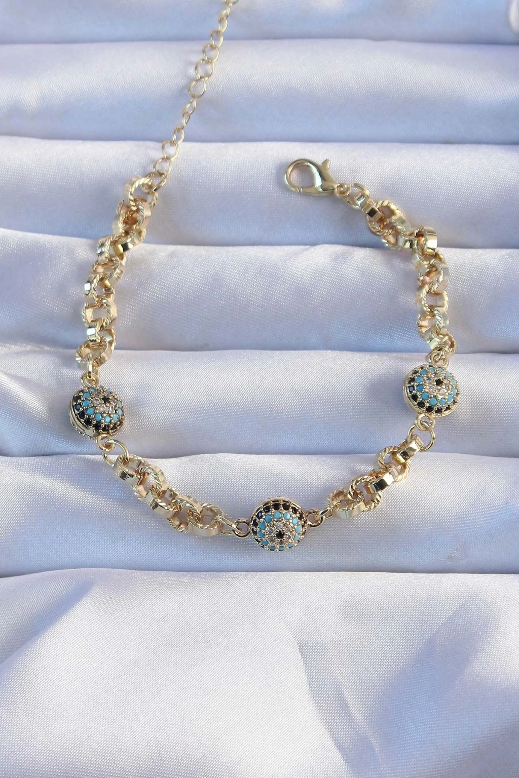 BFS Pirinç Zincir Vip Seri Altın Renk Zirkon Taşlı Nazarlı Bileklik