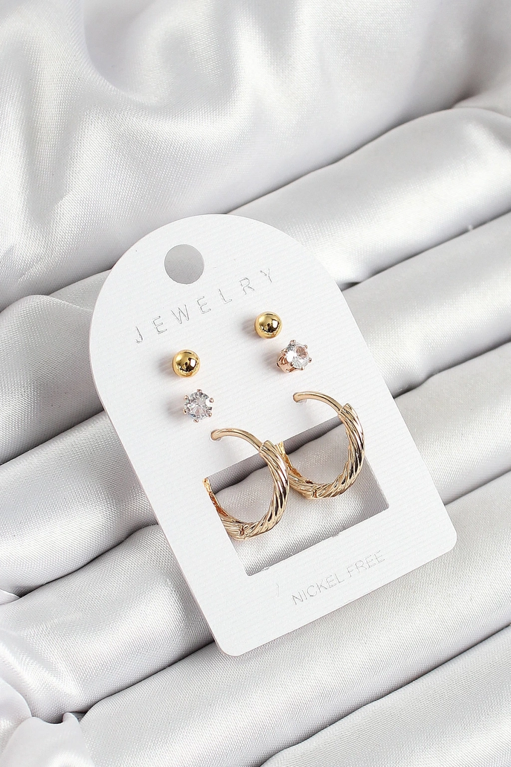 BFS Pirinç Zirkon Taş Ve Halka Figürlü Gold Renk 3'lü Çift Kadın Küpe Set