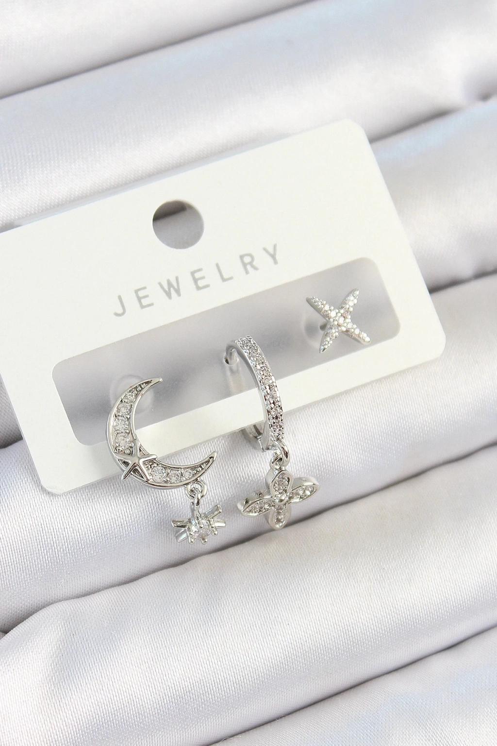 BFS Pirinç Zirkon Taşlı Çiçek Ve Ay Model Gümüş Renk 3'lü Çift Kadın Küpe Set