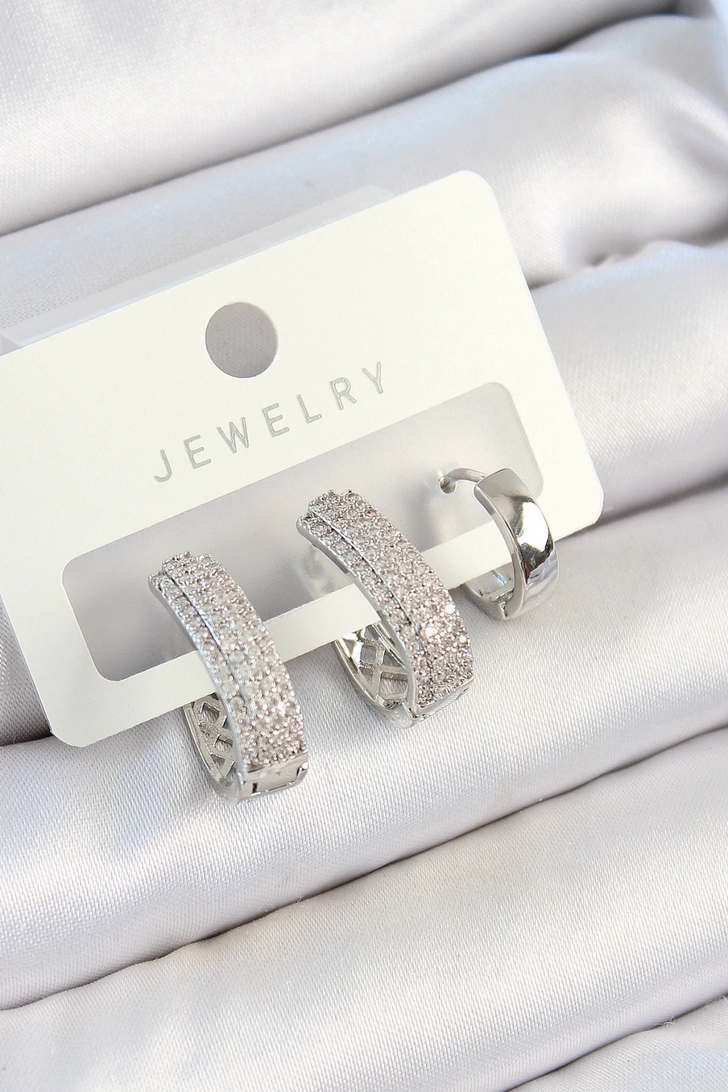 BFS Pirinç Zirkon Taşlı Damla Model Gümüş Renk 3'lü Çift Kadın Küpe Set