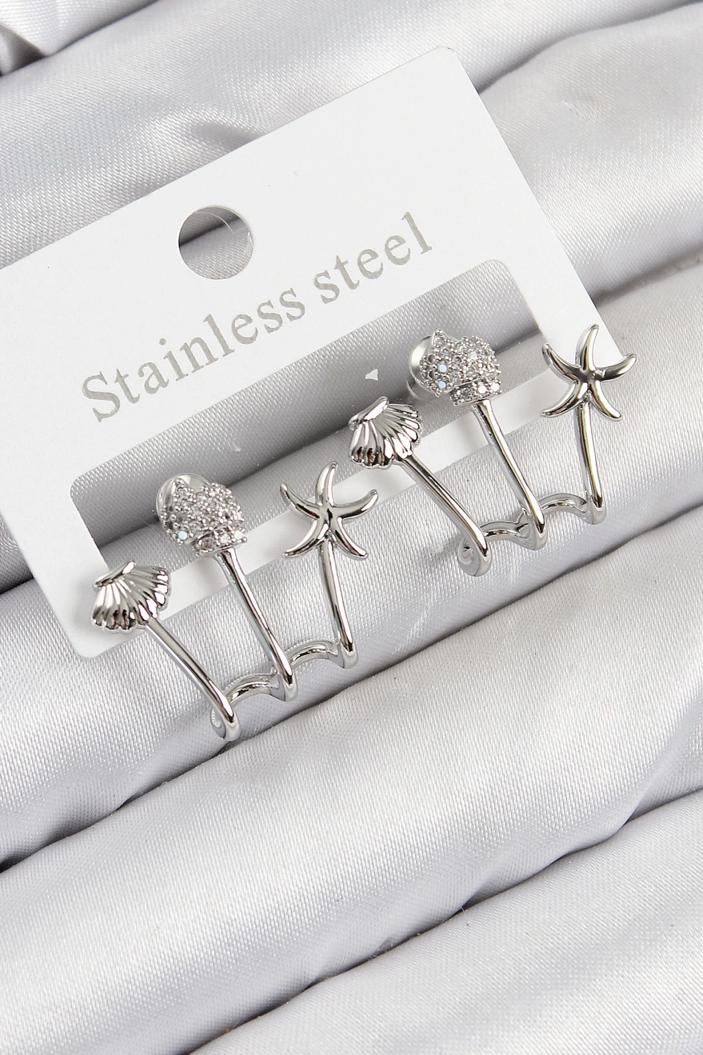 BFS Pirinç Zirkon Taşlı Deniz Yıldızı ve İstiridye Model Gümüş Renk Kadın Küpe