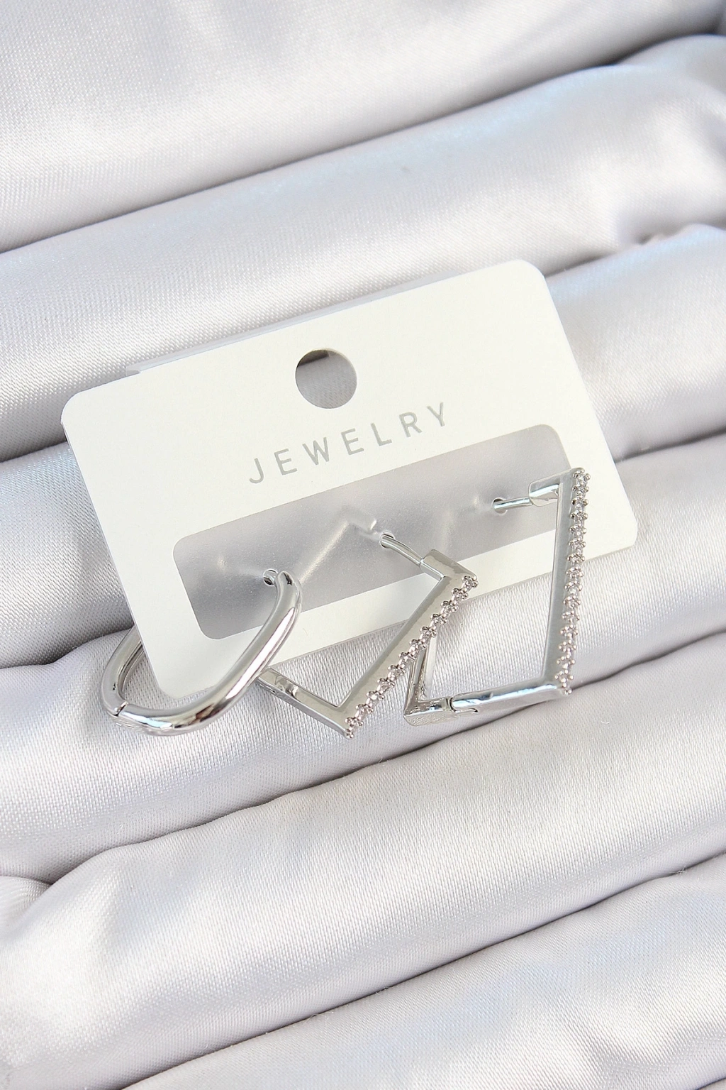 BFS Pirinç Zirkon Taşlı Dikdörtgen Model Gümüş Renk 3'lü Çift Kadın Küpe Set