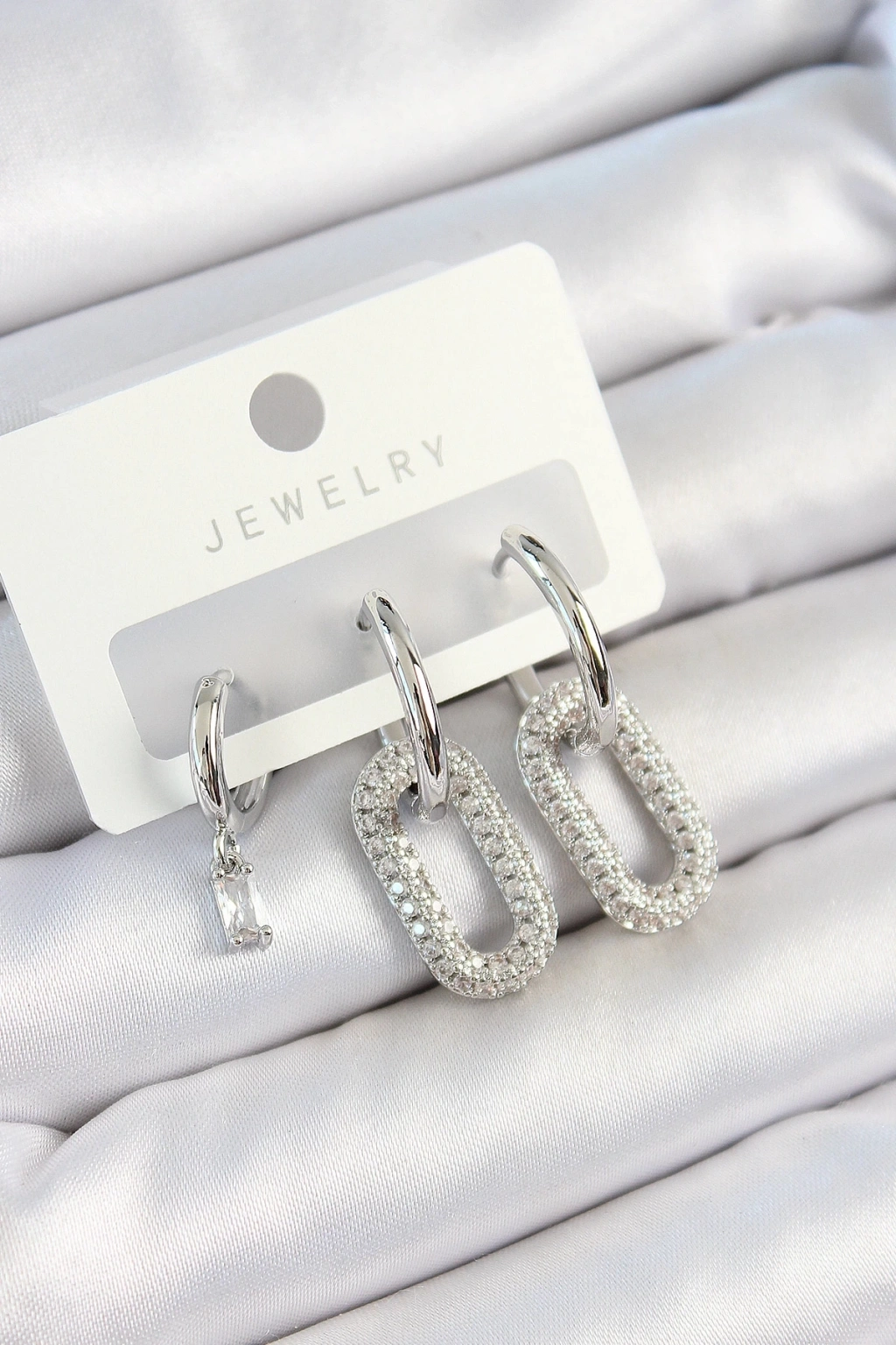 BFS Pirinç Zirkon Taşlı Dikdörtgen Model Gümüş Renk 3'lü Çift Kadın Küpe Set