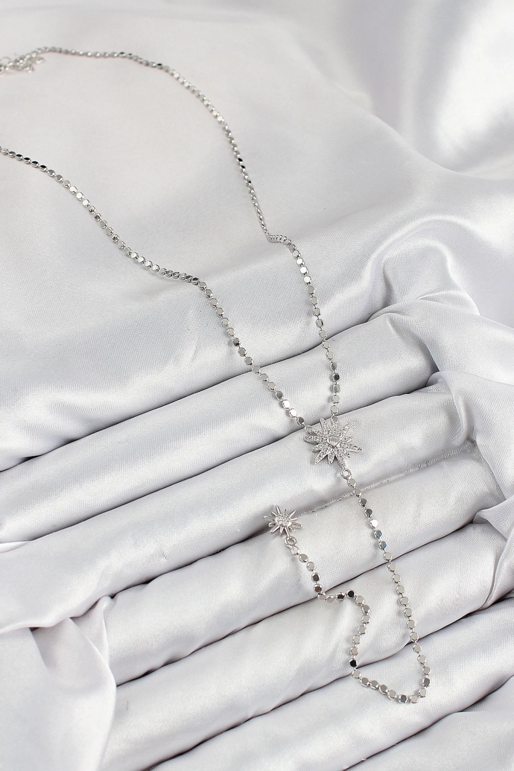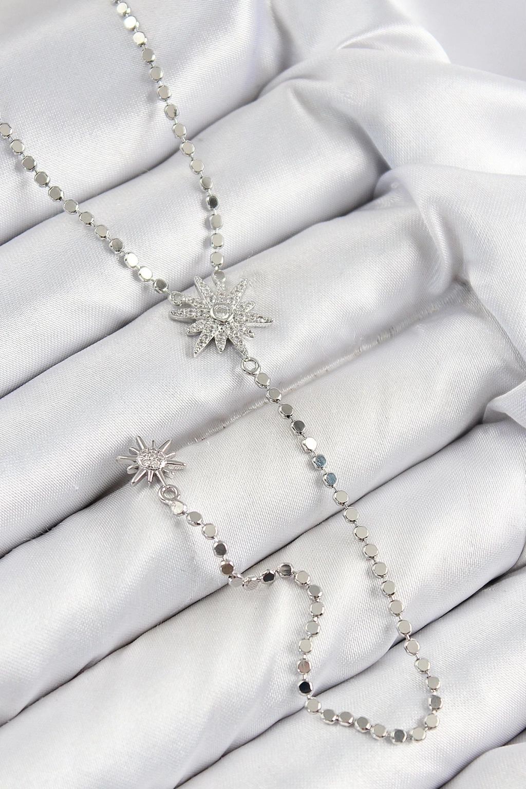 BFS Pirinç Zirkon Taşlı Ezme Zincirli Kutup Yıldızı Model Gümüş Renk Y Kolye