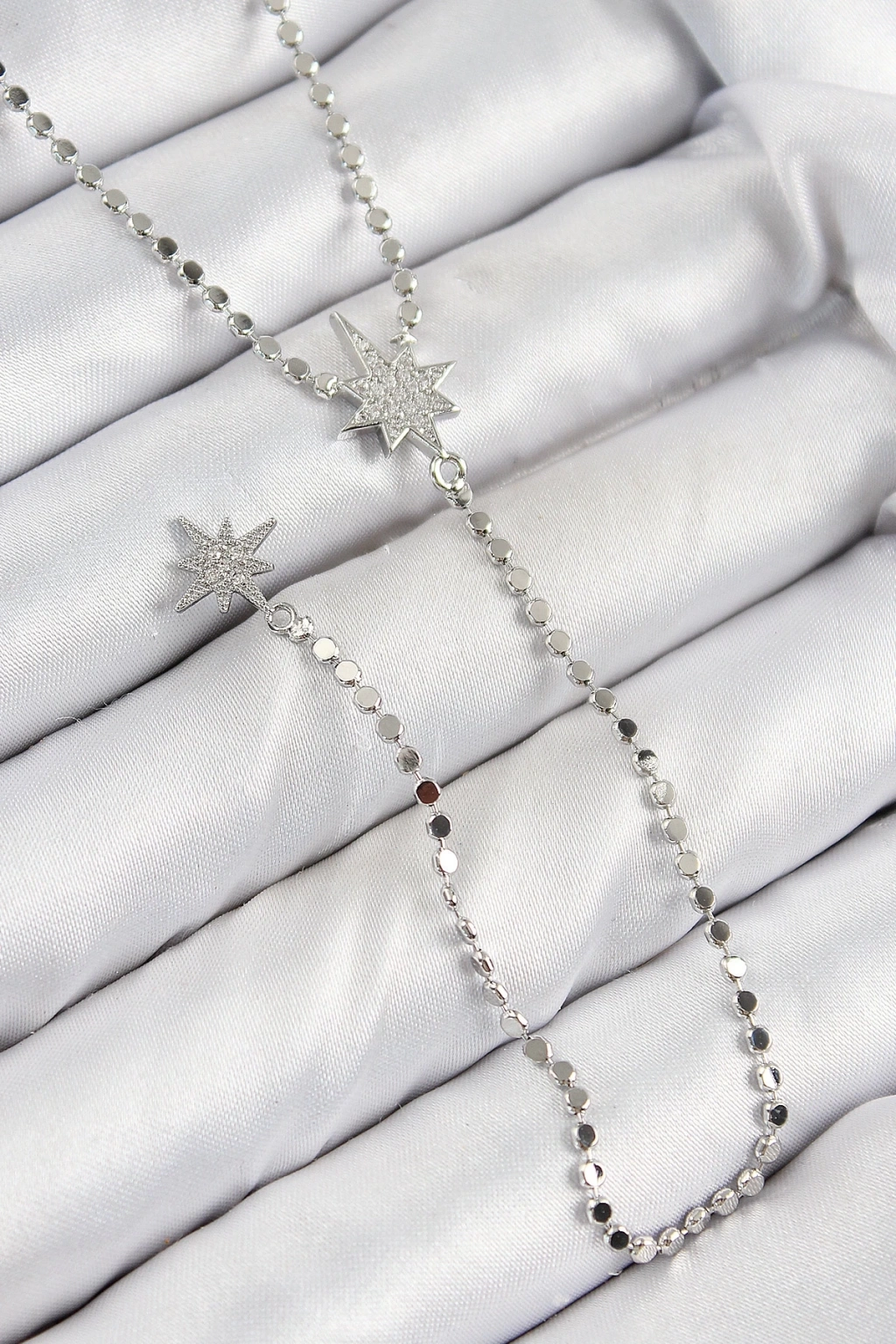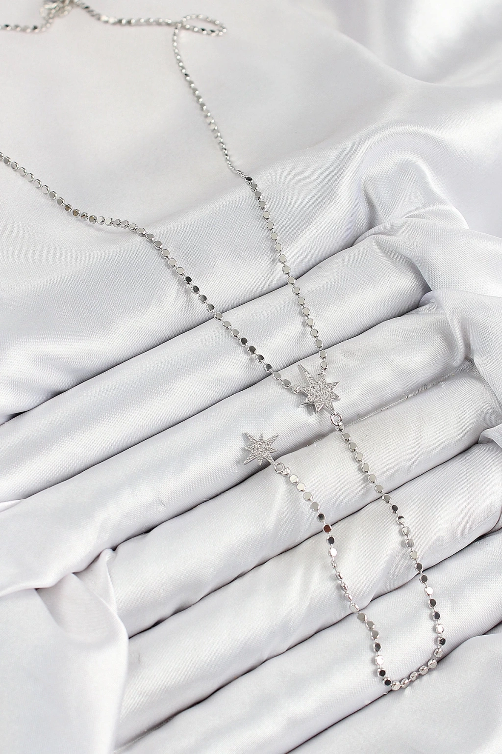 BFS Pirinç Zirkon Taşlı Ezme Zincirli Kutup Yıldızı Model Gümüş Renk Y Kolye