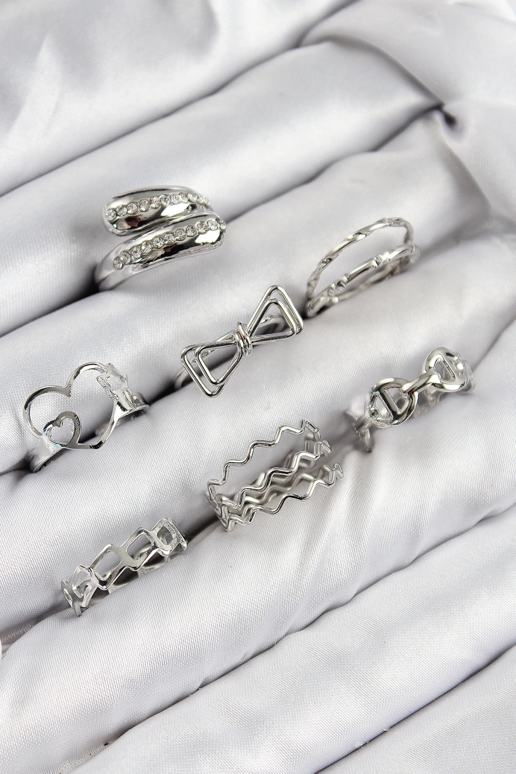 BFS Pirinç Zirkon Taşlı Fiyonk Ve Kalp Model Gümüş Renk Kadın Yüzük Kombin Set
