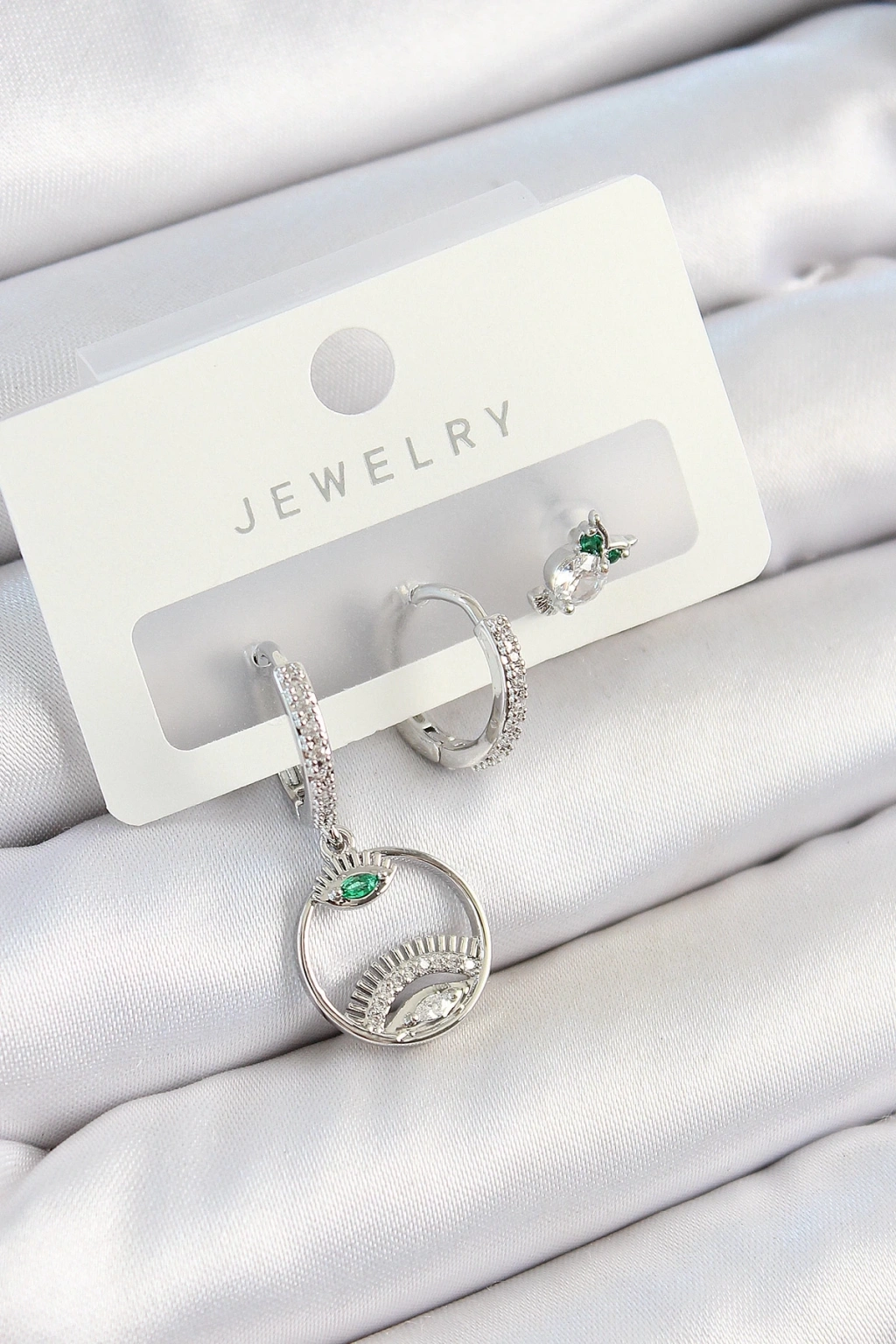 BFS Pirinç Zirkon Taşlı Göz Ve Baykuş Model Gümüş Renk 3'lü Çift Kadın Küpe Set