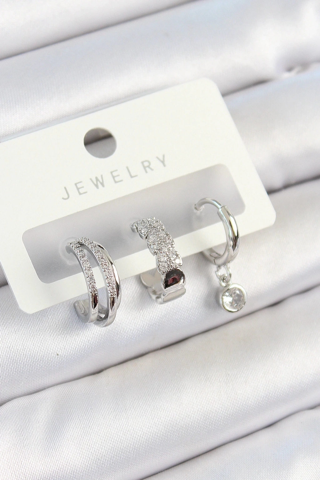 BFS Pirinç Zirkon Taşlı Halka Model Gümüş Renk 3'lü Çift Kadın Küpe Set