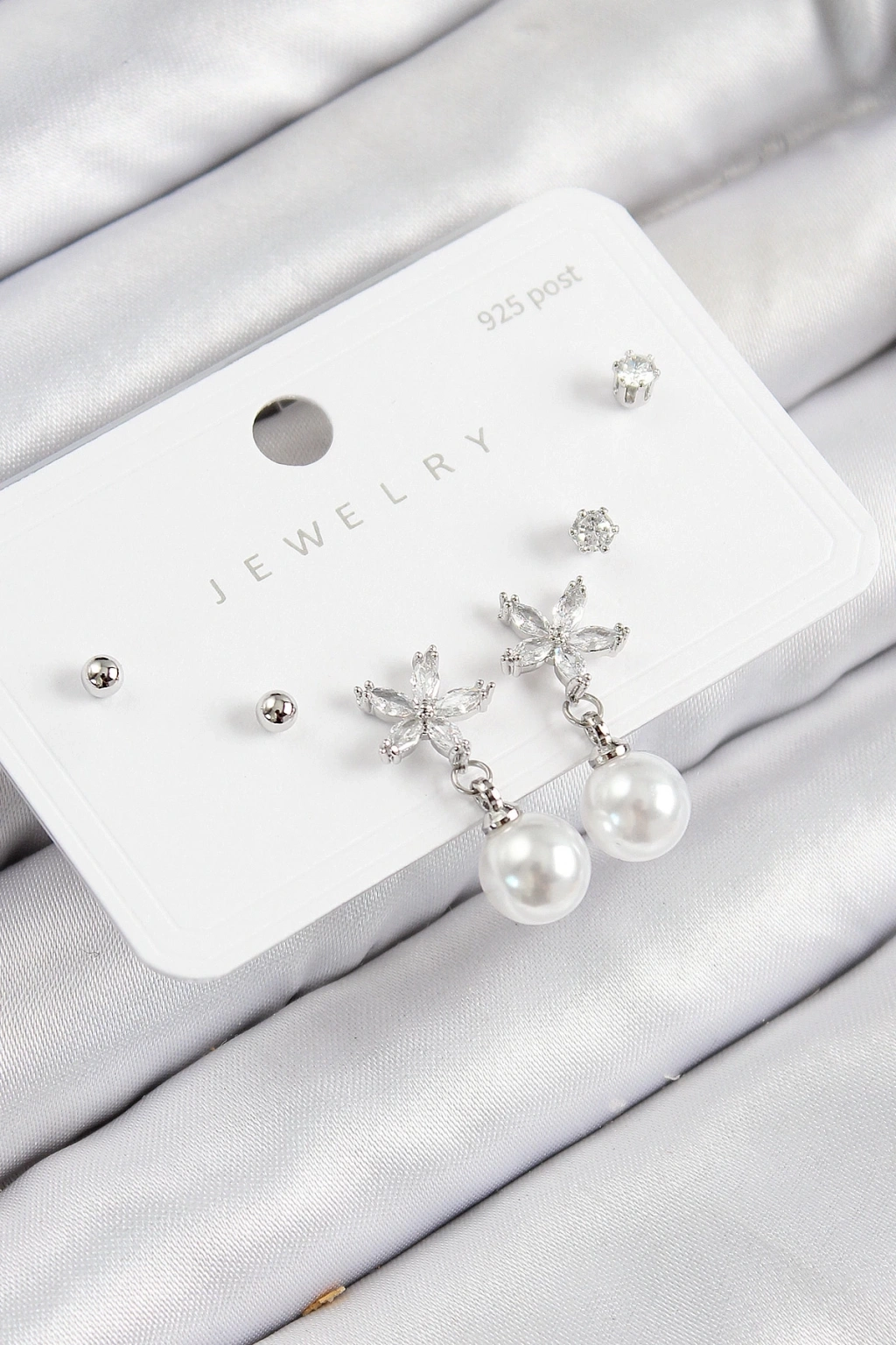 BFS Pirinç Zirkon Taşlı İnci Sallantılı Çiçek Model Gümüş Renk 925 Ayar Gümüş Çivi Kadın Küpe Set