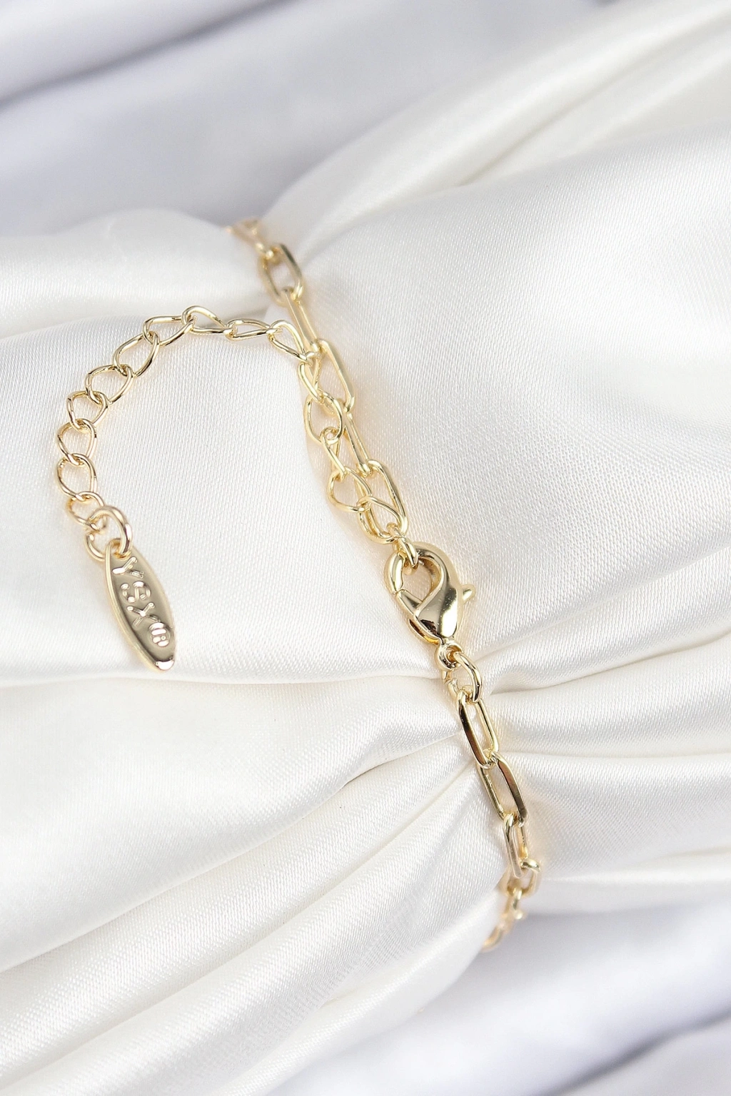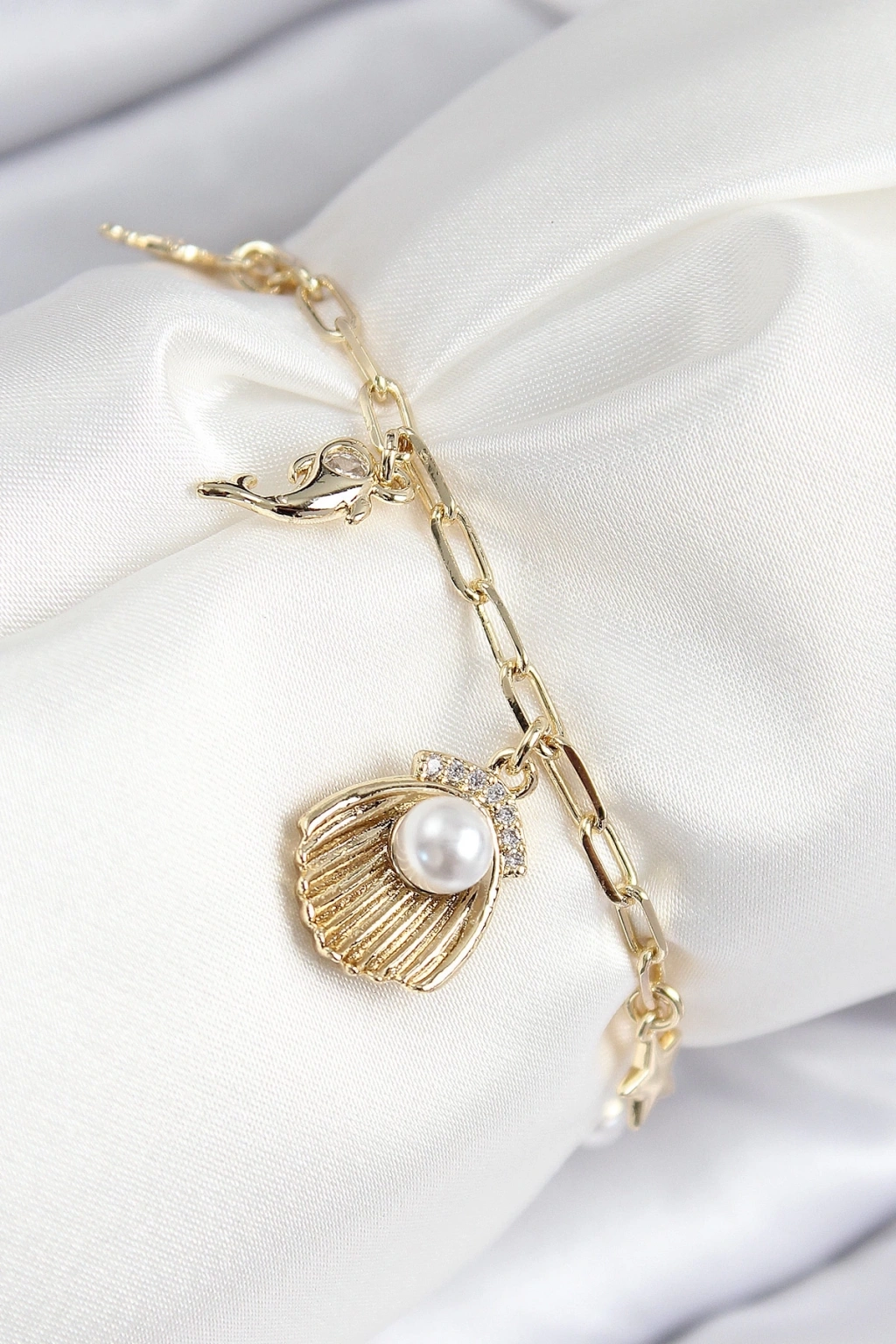 BFS Pirinç Zirkon Taşlı İncili İstiridye Model Gold Renk Kadın Bileklik