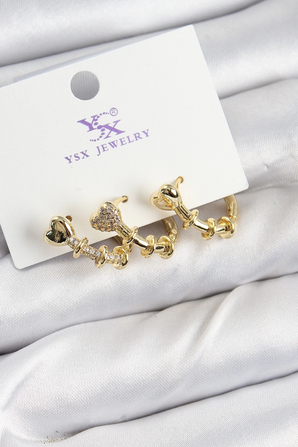 BFS Pirinç Zİrkon Taşlı Kalp Model Gold Renk 3'lü Kadın Küpe