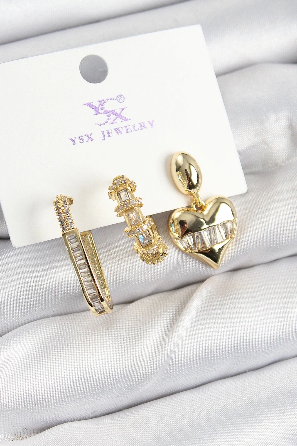 BFS Pirinç Zİrkon Taşlı Kalp Model Gold Renk 3'lü Kadın Küpe