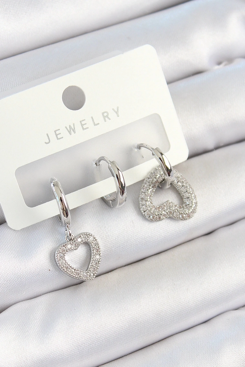 BFS Pirinç Zirkon Taşlı Kalp Model Gümüş Renk 3'lü Çift Kadın Küpe Set