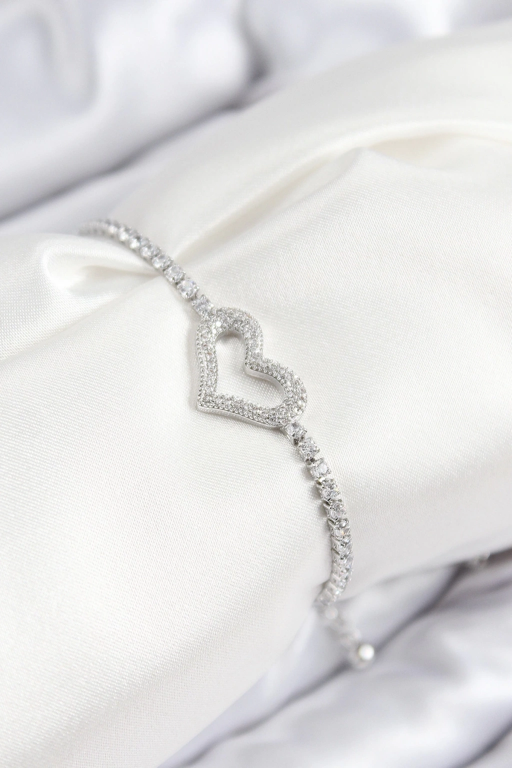 BFS Pirinç Zirkon Taşlı Kalp Model Gümüş Renk Asansörlü Kadın Bileklik