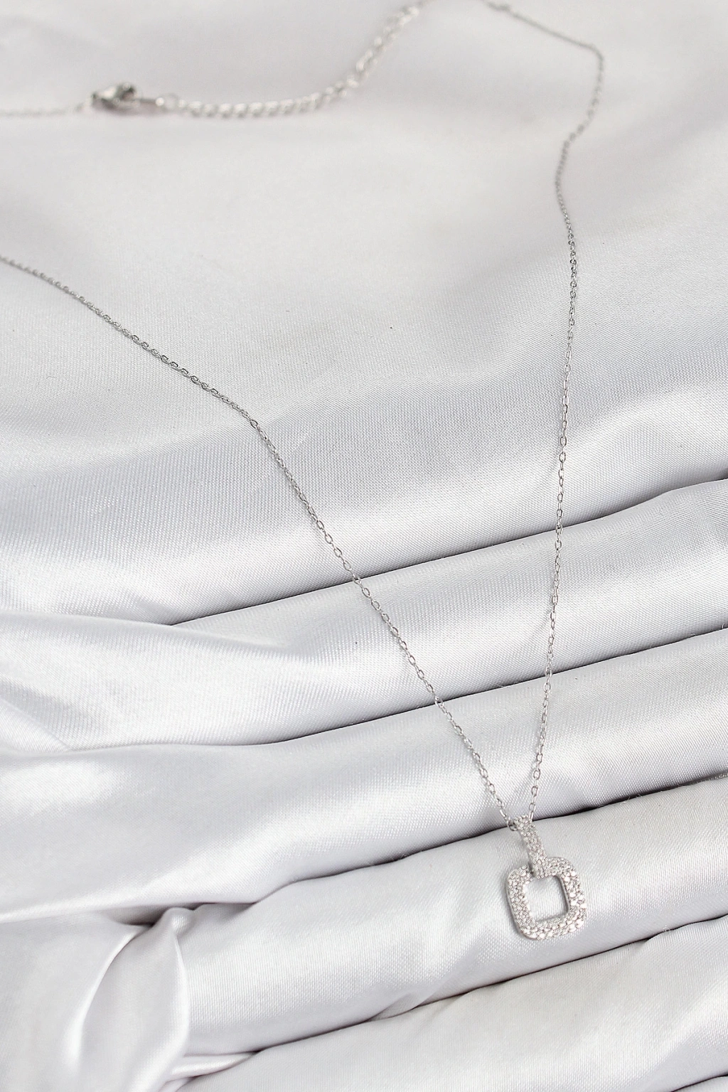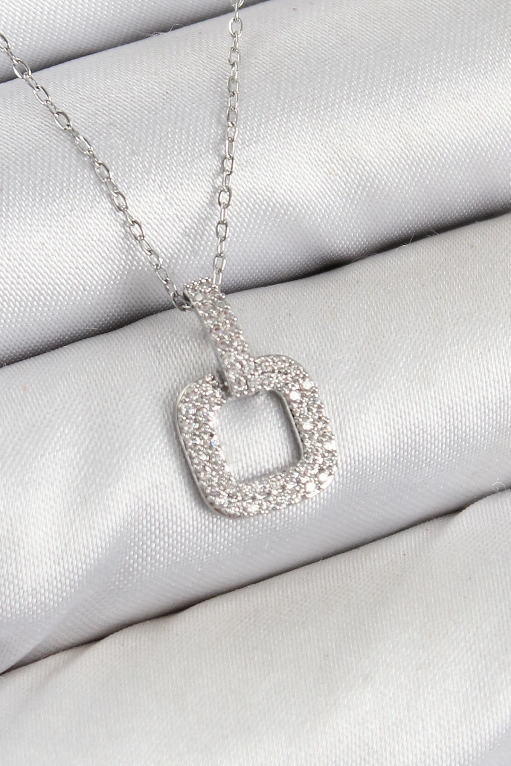 BFS Pirinç Zirkon Taşlı Kare Model Gümüş Renk Kadın Kolye