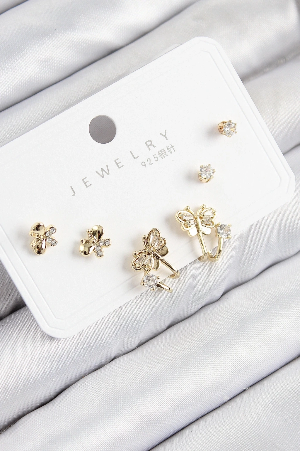BFS Pirinç Zirkon Taşlı Kelebek Model Gold Renk 925 Ayar Gümüş Çivi Kadın Küpe Set