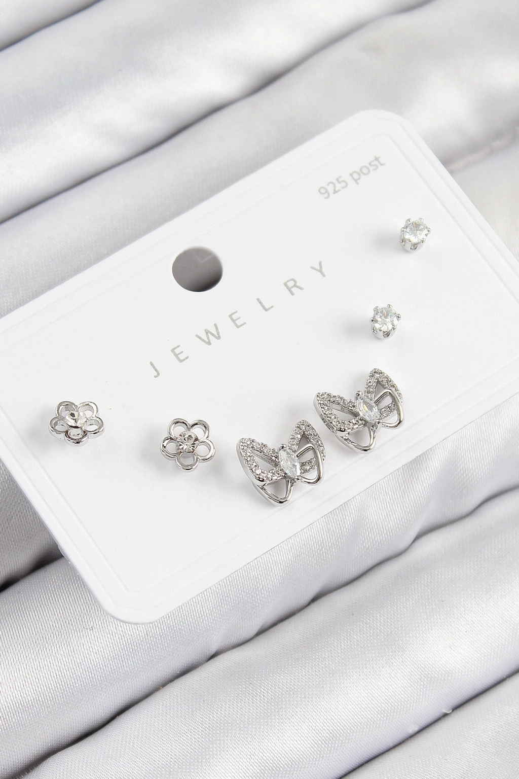 BFS Pirinç Zirkon Taşlı Kelebek Model Gümüş Renk 925 Ayar Gümüş Çivi Kadın Küpe Set