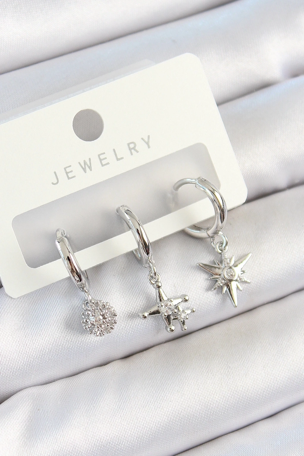 BFS Pirinç Zirkon Taşlı Kutup Yıldızı Model Gümüş Renk 3'lü Çift Kadın Küpe Set
