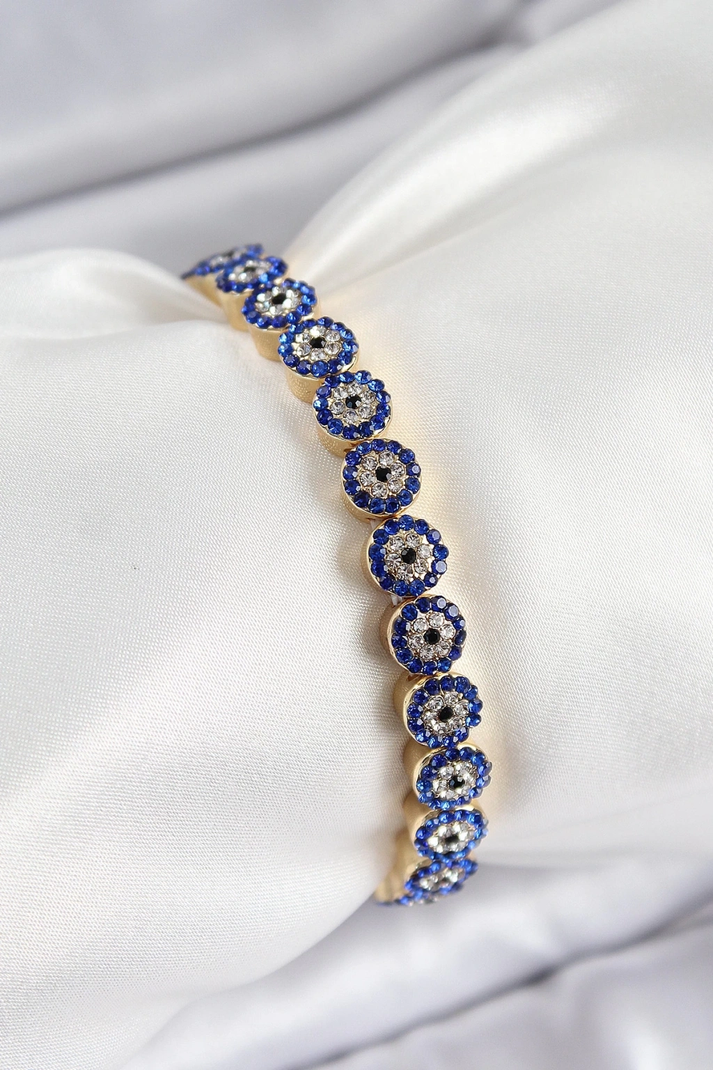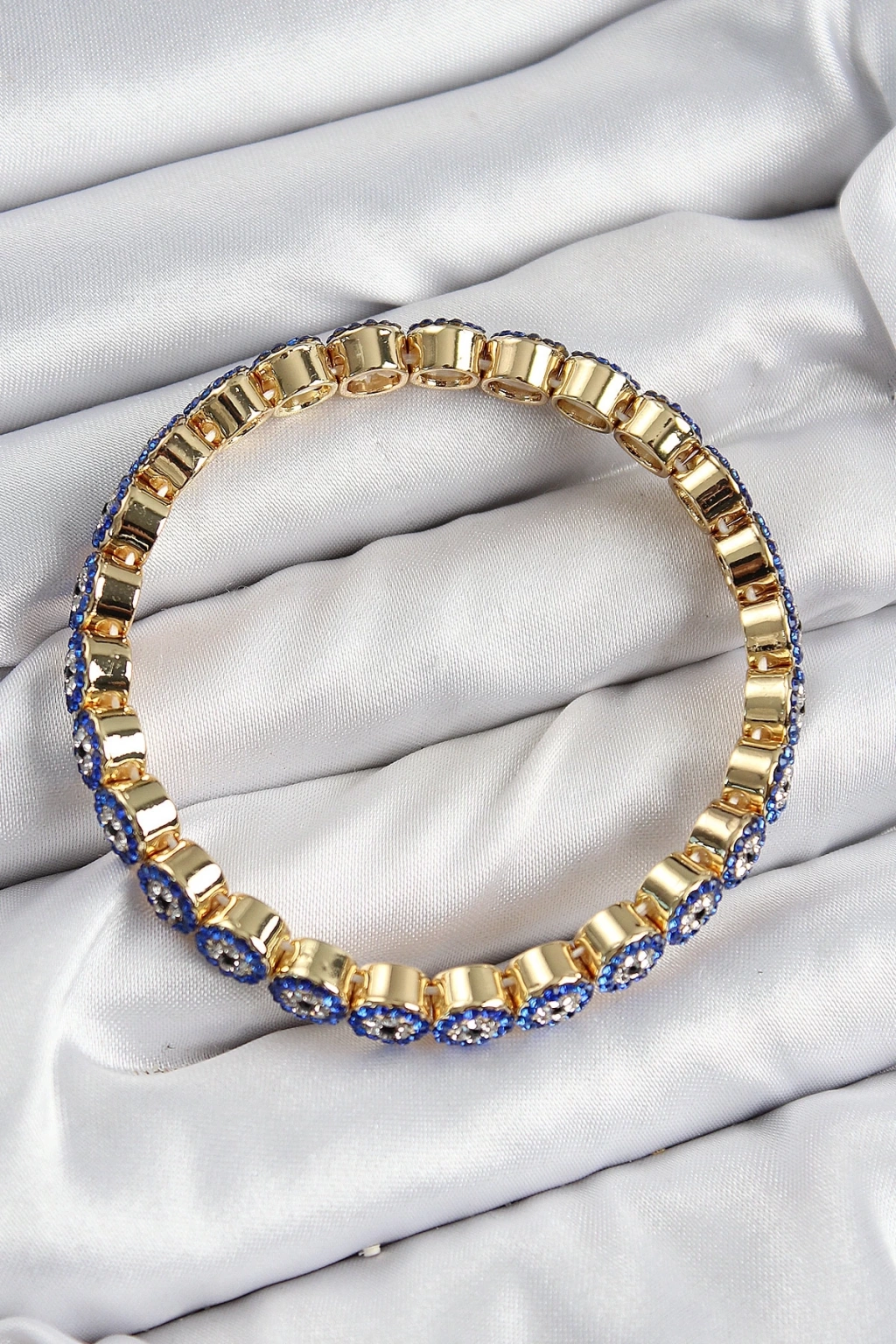 BFS Pirinç Zirkon Taşlı Lacivert Nazar Model Gold Renk Lastikli Kadın Bileklik