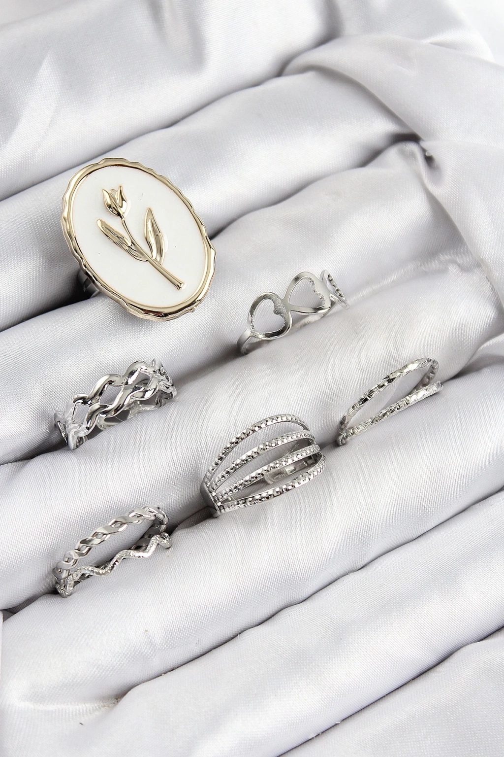 BFS Pirinç Zirkon Taşlı Lale Model Gümüş Renk Kadın Yüzük Kombin Set