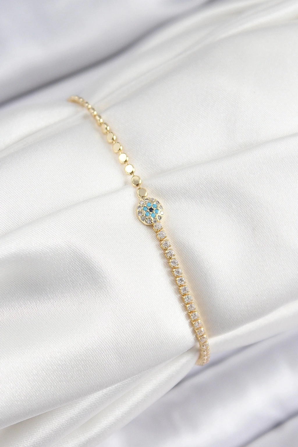 BFS Pirinç Zirkon Taşlı Nazar Model Ezme Zincir Gold Renk Kadın Bileklik