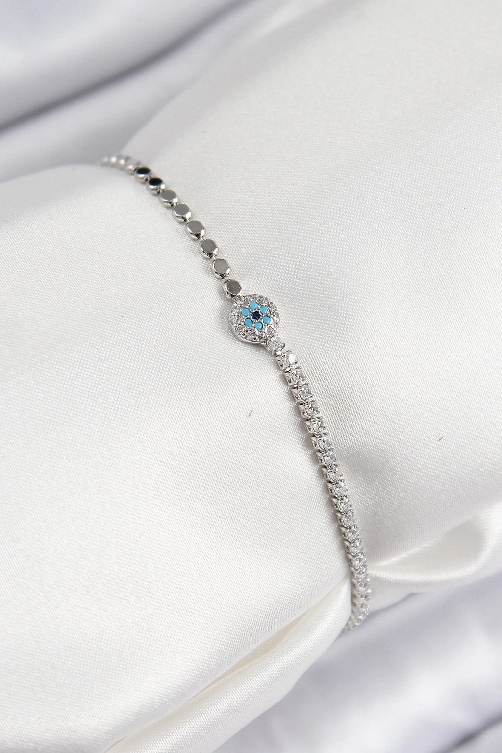 BFS Pirinç Zirkon Taşlı Nazar Model Ezme Zincir Gümüş Renk Kadın Bileklik